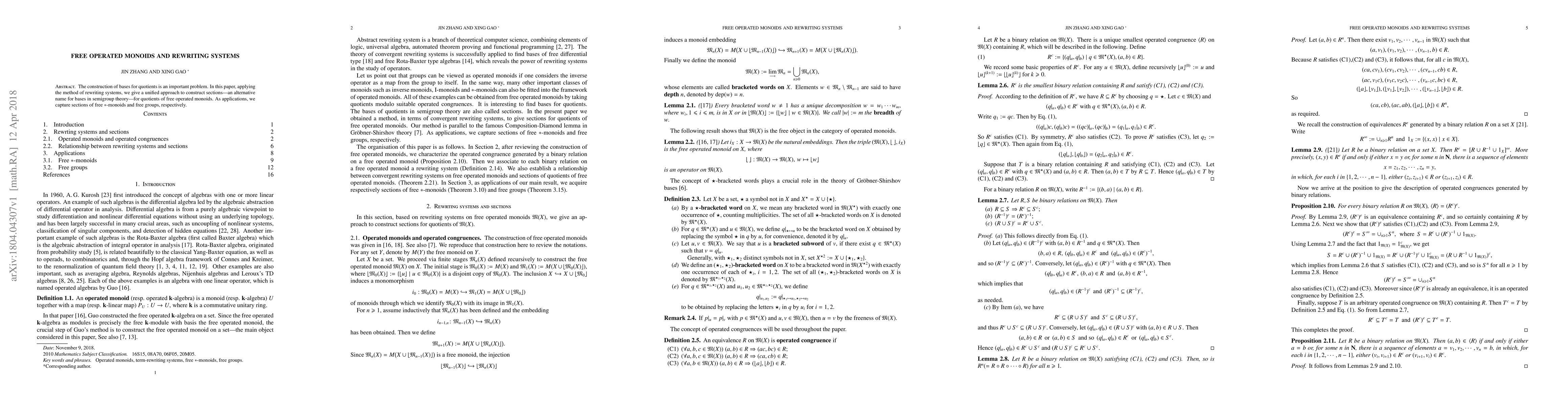 This paper presents a unified approach using rewriting systems to construct sections (bases) for quotients of free operated monoids, with applications to free $\ast$-monoids and free groups. The method provides a comprehensive solution to the construction of bases for these algebraic structures.