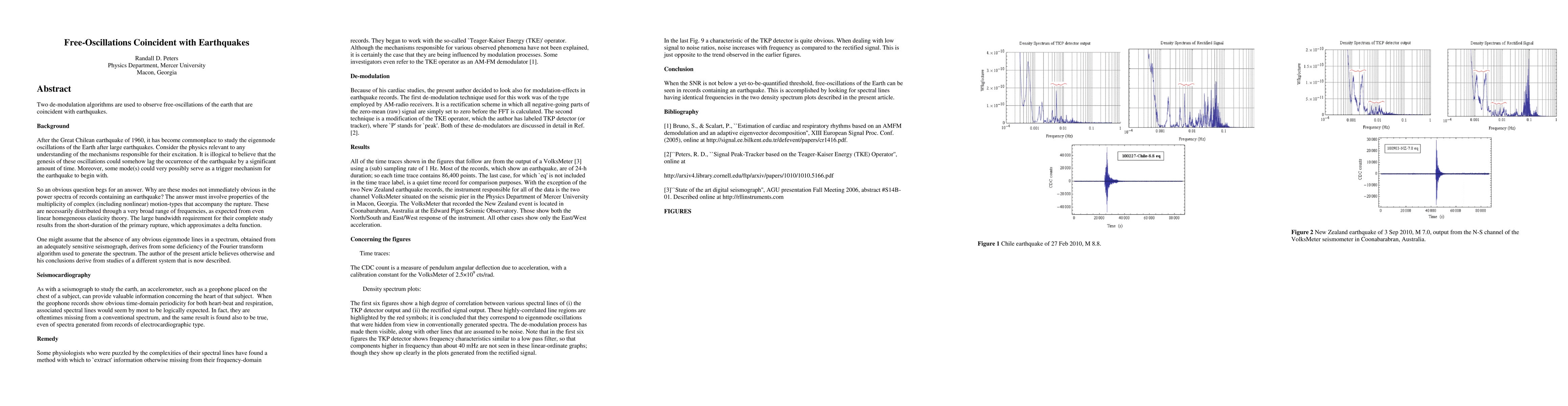 Summary: The study employs two de-modulation algorithms to detect free-oscillations in the Earth that coincide with earthquake events, providing insights into seismic phenomena.