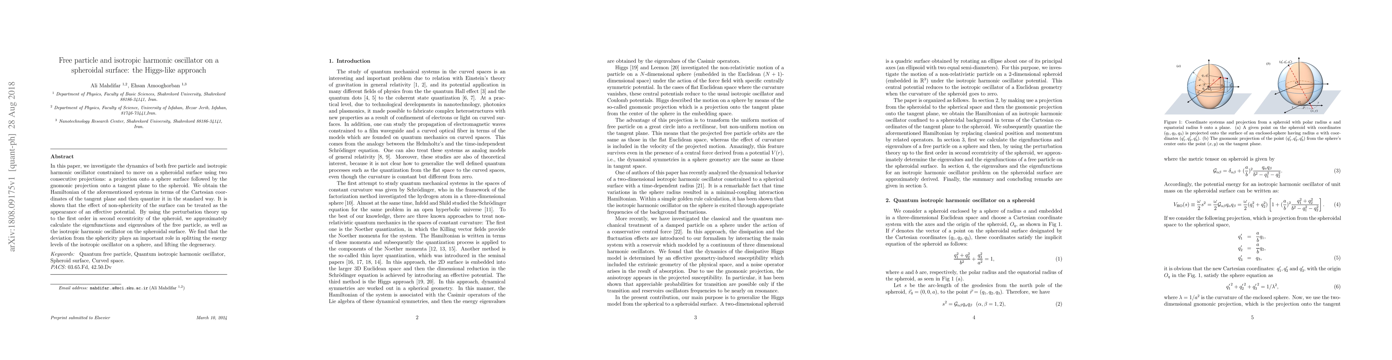 This paper explores the dynamics of free particles and isotropic harmonic oscillators on a spheroidal surface by projecting them onto a tangent plane. It quantizes the systems and shows that the non-sphericity introduces an effective potential, affecting the energy levels and lifting the degeneracy of the oscillator.