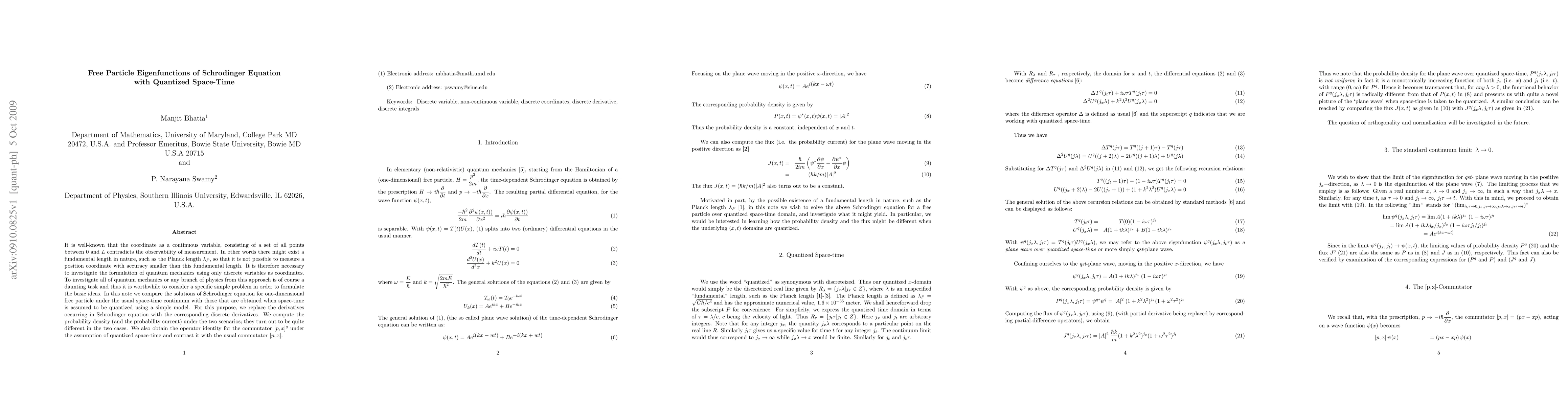 It is well-known that the coordinate as a continuous variable, consisting of a set of all points between 0 and $L$ contradicts the observability of measurement. In other words there might exist a fundamental length in nature, such as the Planck length $\lambda_P$, so that it is not possible to measure a position coordinate with accuracy smaller than this fundamental length. It is therefore necessary to investigate the formulation of quantum mechanics using only discrete variables as coordinates. To investigate all of quantum mechanics or any branch of physics from this approach is of course a daunting task and thus it is worthwhile to consider a specific simple problem in order to formulate the basic ideas. In this note we compare the solutions of Schrodinger equation for one-dimensional free particle under the usual space-time continuum with those that are obtained when space-time is assumed to be quantized using a simple model. For this purpose, we replace the derivatives occurring in Schrodinger equation with the corresponding discrete derivatives. We compute the probability density (and the probability current) under the two scenarios; they turn out to be quite different in the two cases. We also obtain the operator identity for the commutator $[p,x]^q$ under the assumption of quantized space-time and contrast it with the usual commutator $[p,x]$.