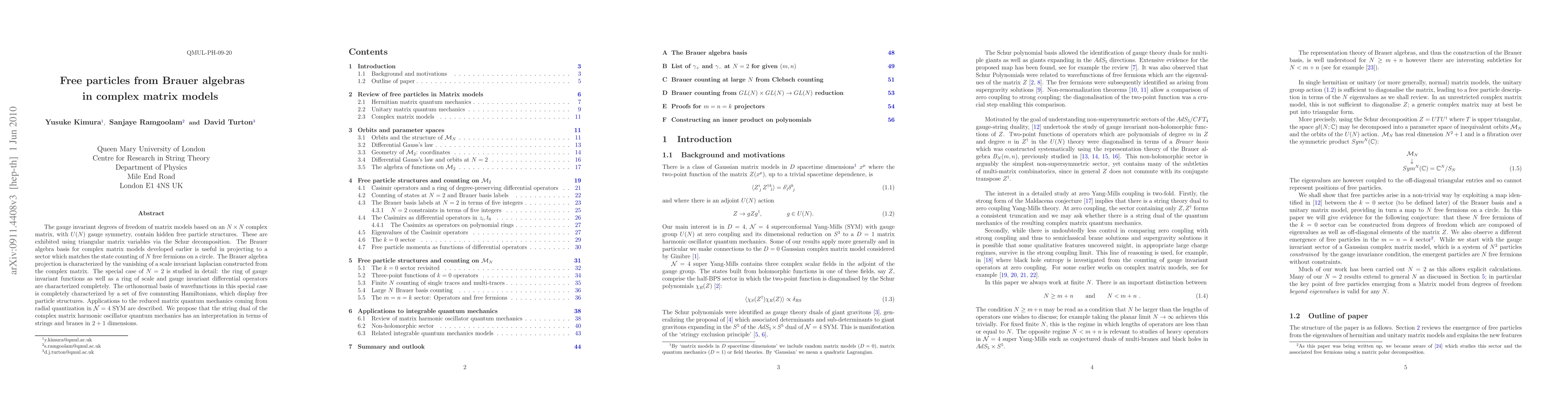 The gauge invariant degrees of freedom of matrix models based on an N x N complex matrix, with U(N) gauge symmetry, contain hidden free particle structures. These are exhibited using triangular matrix variables via the Schur decomposition. The Brauer algebra basis for complex matrix models developed earlier is useful in projecting to a sector which matches the state counting of N free fermions on a circle. The Brauer algebra projection is characterized by the vanishing of a scale invariant laplacian constructed from the complex matrix. The special case of N=2 is studied in detail: the ring of gauge invariant functions as well as a ring of scale and gauge invariant differential operators are characterized completely. The orthonormal basis of wavefunctions in this special case is completely characterized by a set of five commuting Hamiltonians, which display free particle structures. Applications to the reduced matrix quantum mechanics coming from radial quantization in N=4 SYM are described. We propose that the string dual of the complex matrix harmonic oscillator quantum mechanics has an interpretation in terms of strings and branes in 2+1 dimensions.