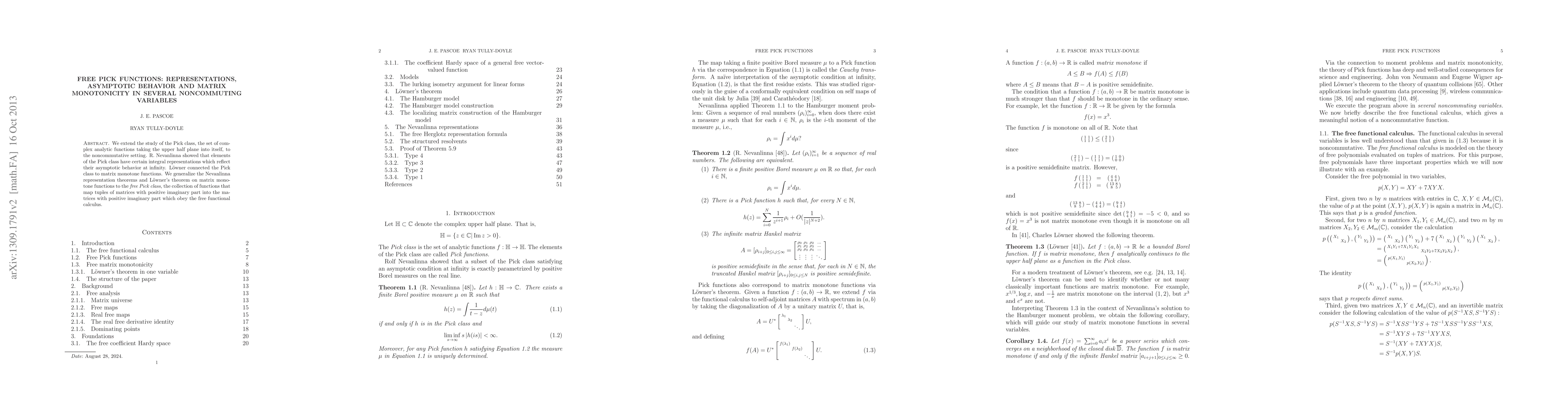 This paper extends the Pick class to noncommutative settings, generalizing integral representations and asymptotic behavior of Pick functions to tuples of matrices. It also extends Loewner's theorem on matrix monotone functions to the free Pick class, which maps matrices with positive imaginary parts under the free functional calculus.