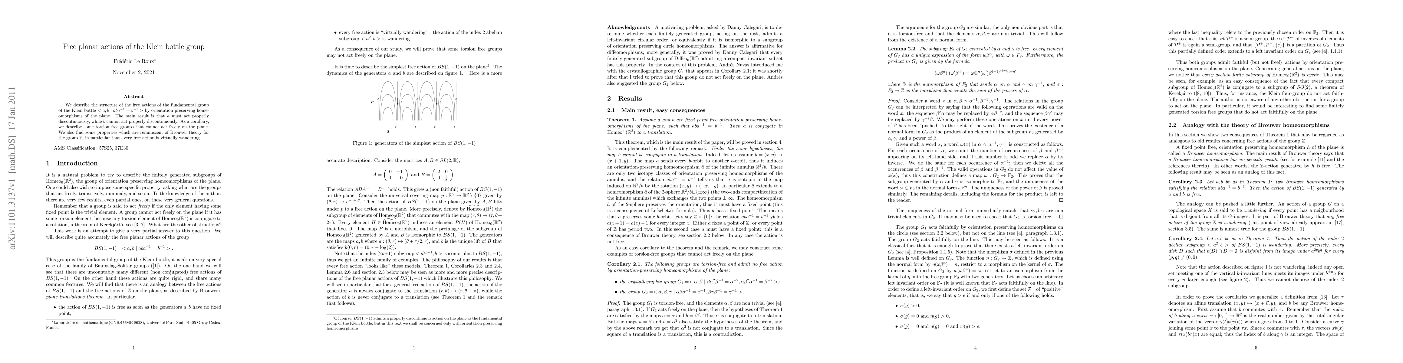 This paper investigates free planar actions of the Klein bottle group, showing that one generator acts properly discontinuously while the other does not. It concludes with a corollary identifying torsion-free groups incapable of free planar actions and notes similarities to Brouwer theory for infinite cyclic groups.