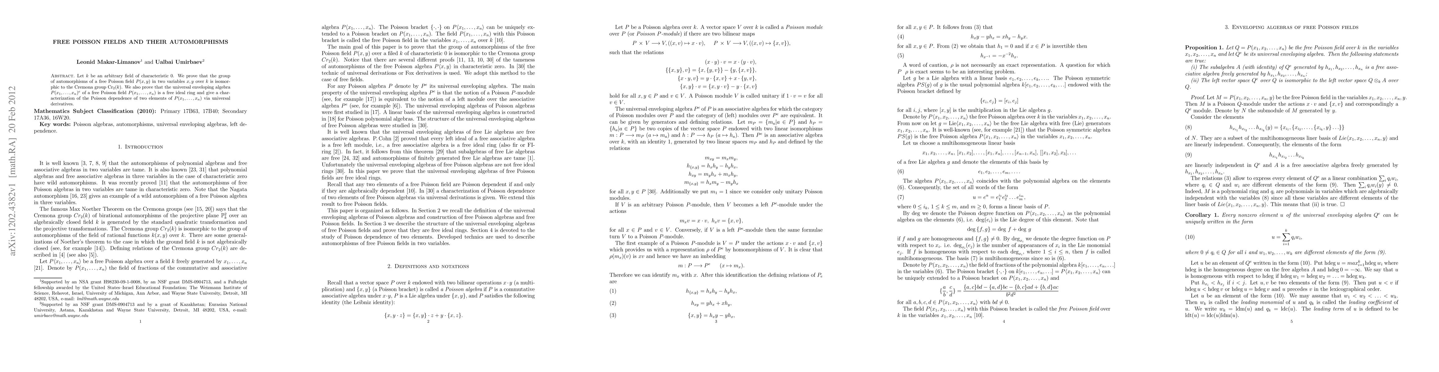 Let $k$ be an arbitrary field of characteristic 0. We prove that the group of automorphisms of a free Poisson field $P(x,y)$ in two variables $x,y$ over $k$ is isomorphic to the Cremona group $\mathrm{Cr}_2(k)$. We also prove that the universal enveloping algebra $P(x_1,...,x_n)^e$ of a free Poisson field $P(x_1,...,x_n)$ is a free ideal ring and give a characterization of the Poisson dependence of two elements of $P(x_1,...,x_n)$ via universal derivatives.