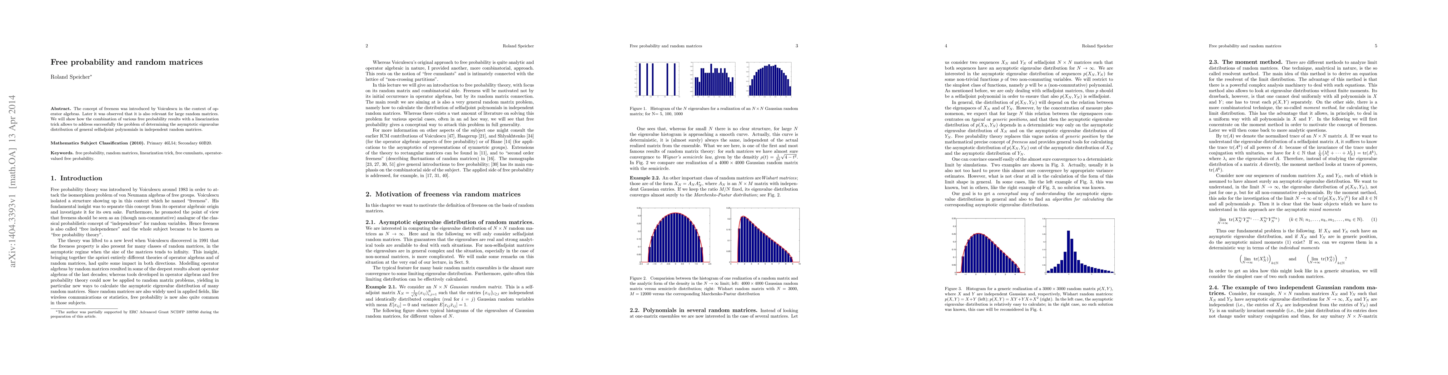 The concept of freeness was introduced by Voiculescu in the context of operator algebras. Later it was observed that it is also relevant for large random matrices. We will show how the combination of various free probability results with a linearization trick allows to address successfully the problem of determining the asymptotic eigenvalue distribution of general selfadjoint polynomials in independent random matrices.
