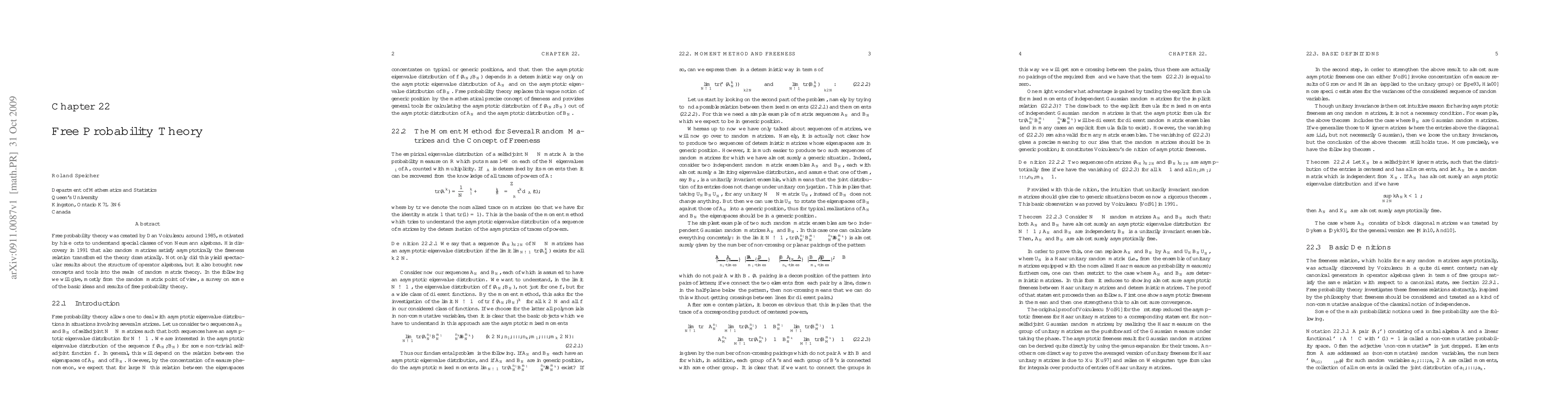 Free probability theory, developed by Dan Voiculescu, explores the asymptotic behavior of random matrices and provides new insights into operator algebras and von Neumann algebras. This theory has introduced significant advancements in both random matrix theory and the structure of operator algebras.