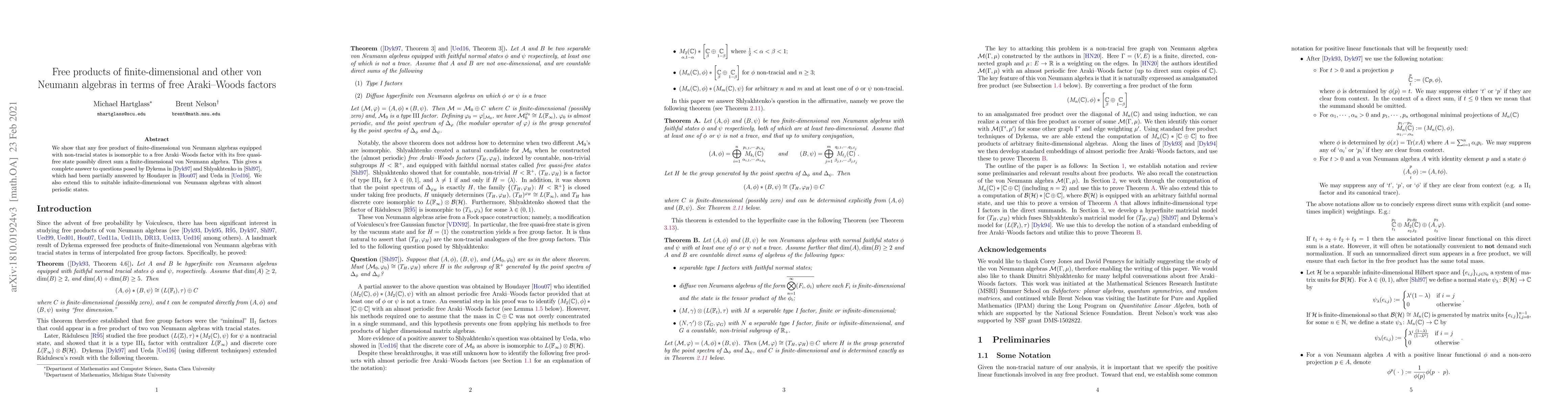 We show that any free product of finite-dimensional von Neumann algebras equipped with non-tracial states is isomorphic to a free Araki-Woods factor with its free quasi-free state possibly direct sum a finite-dimensional von Neumann algebra. This gives a complete answer to questions posed by Dykema and Shlyakhtenko, which had been partially answered by work of Houdayer and work of Ueda. We also extend this to suitable infinite-dimensional von Neumann algebras with almost periodic states.