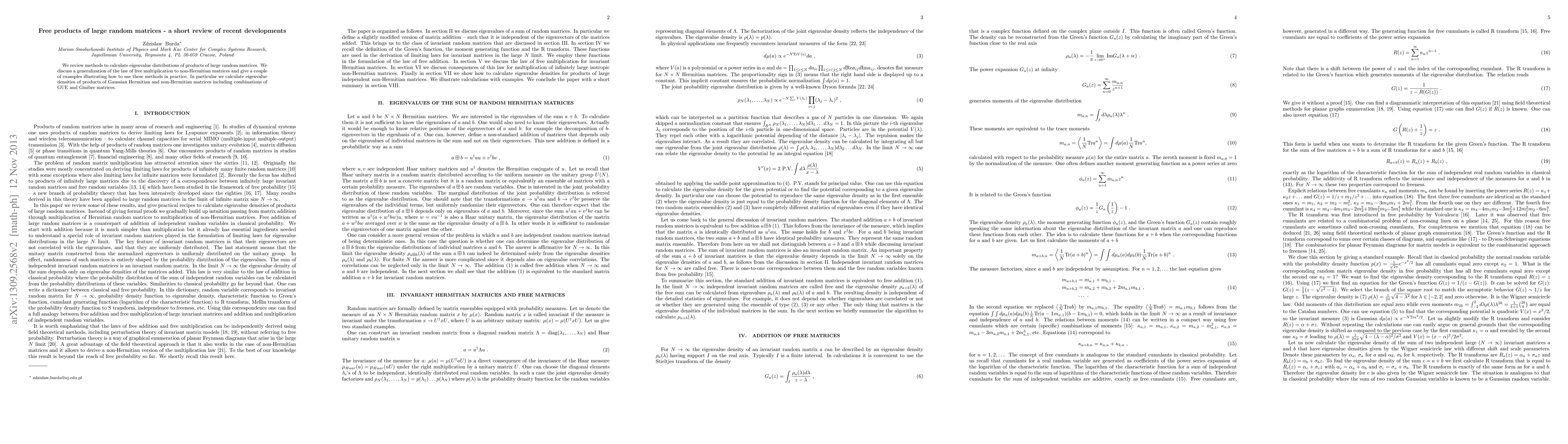 This paper reviews recent advancements in calculating the eigenvalue distributions of products of large random matrices, focusing on the generalization of the law of free multiplication to non-Hermitian matrices. It also provides practical examples using Gaussian Hermitian and non-Hermitian matrices, including GUE and Ginibre matrices.