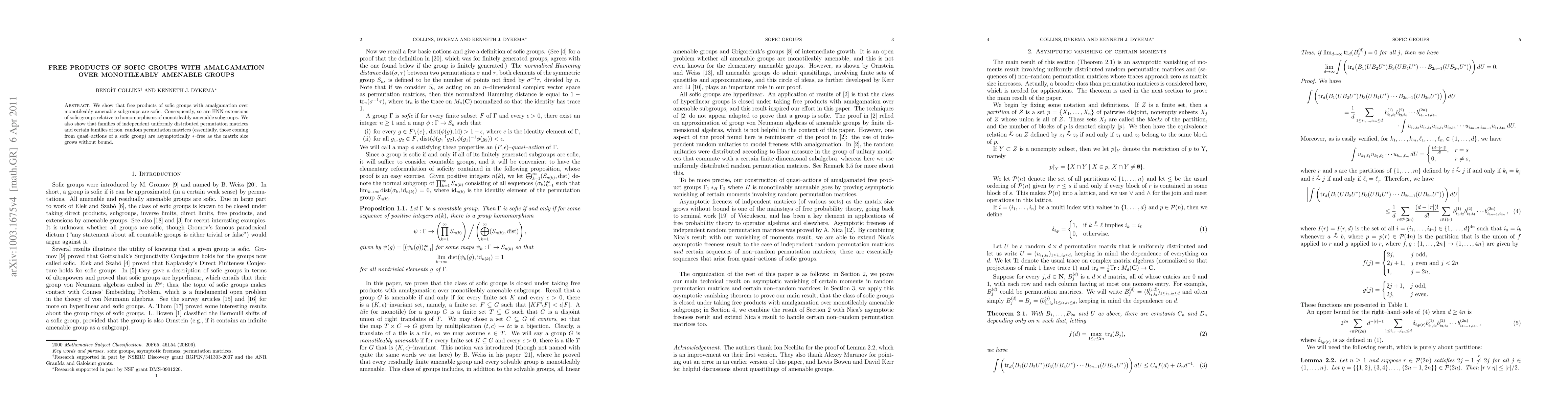 This paper demonstrates that free products of sofic groups amalgamated over monotileably amenable subgroups remain sofic. It also proves that HNN extensions of sofic groups relative to homomorphisms of such subgroups are sofic, and explores the asymptotic *-freeness of certain permutation matrices arising from quasi-actions of sofic groups.