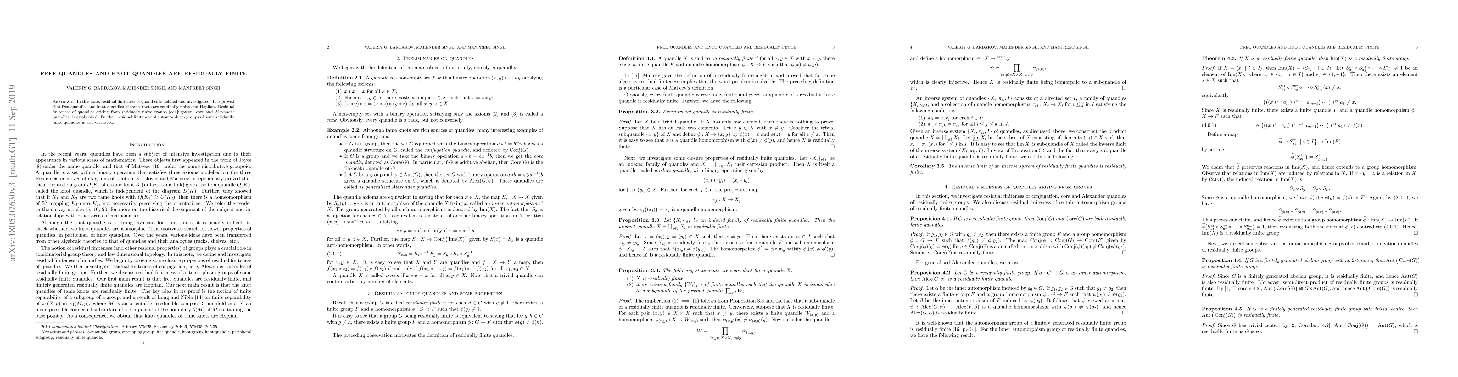 Summary: This paper proves that free quandles and knot quandles of tame knots are residually finite and Hopfian. It also establishes residual finiteness for quandles derived from residually finite groups and discusses the residual finiteness of automorphism groups of certain quandles.