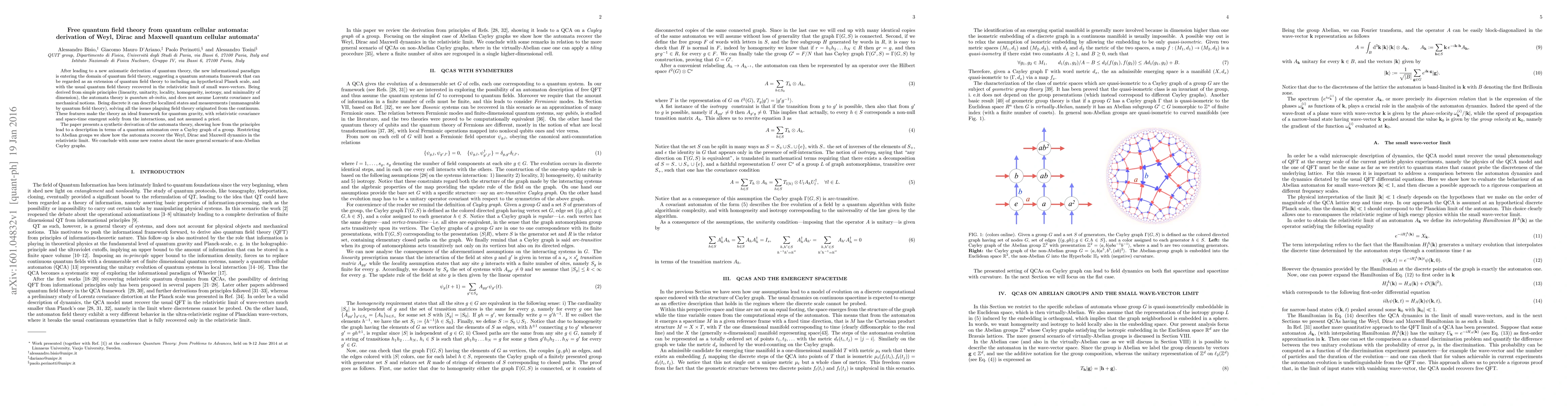After leading to a new axiomatic derivation of quantum theory, the new informational paradigm is entering the domain of quantum field theory, suggesting a quantum automata framework that can be regarded as an extension of quantum field theory to including an hypothetical Planck scale, and with the usual quantum field theory recovered in the relativistic limit of small wave-vectors. Being derived from simple principles (linearity, unitarity, locality, homogeneity, isotropy, and minimality of dimension), the automata theory is quantum ab-initio, and does not assume Lorentz covariance and mechanical notions. Being discrete it can describe localized states and measurements (unmanageable by quantum field theory), solving all the issues plaguing field theory originated from the continuum. These features make the theory an ideal framework for quantum gravity, with relativistic covariance and space-time emergent solely from the interactions, and not assumed a priori. The paper presents a synthetic derivation of the automata theory, showing how from the principles lead to a description in terms of a quantum automaton over a Cayley graph of a group. Restricting to Abelian groups we show how the automata recover the Weyl, Dirac and Maxwell dynamics in the relativistic limit. We conclude with some new routes about the more general scenario of non-Abelian Cayley graphs.