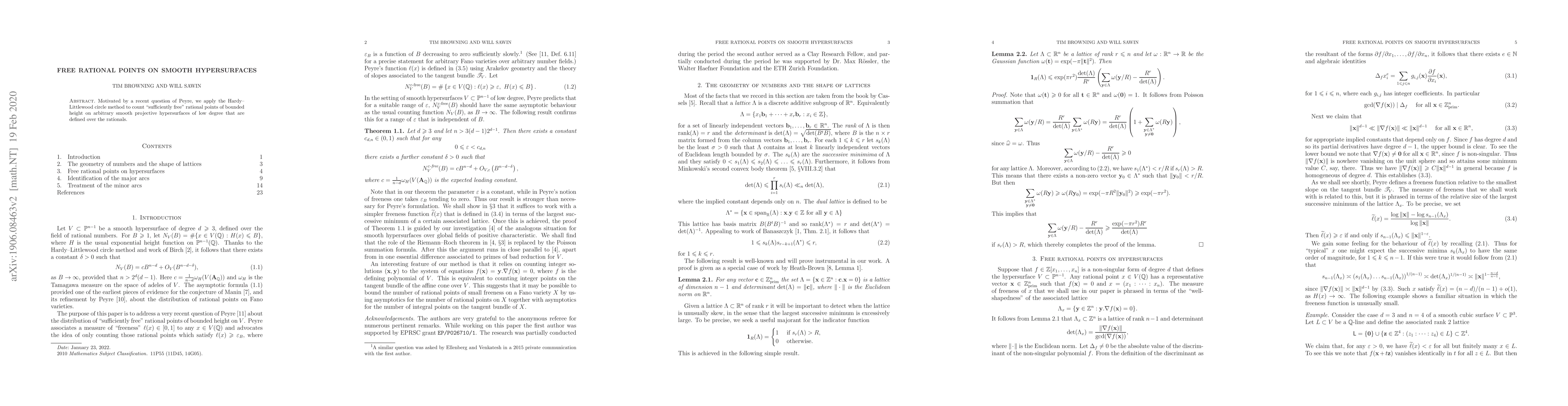 This paper uses the Hardy-Littlewood circle method to count rational points of bounded height on smooth projective hypersurfaces of low degree defined over the rationals, addressing a question posed by Peyre. The focus is on identifying "sufficiently free" rational points on these hypersurfaces.