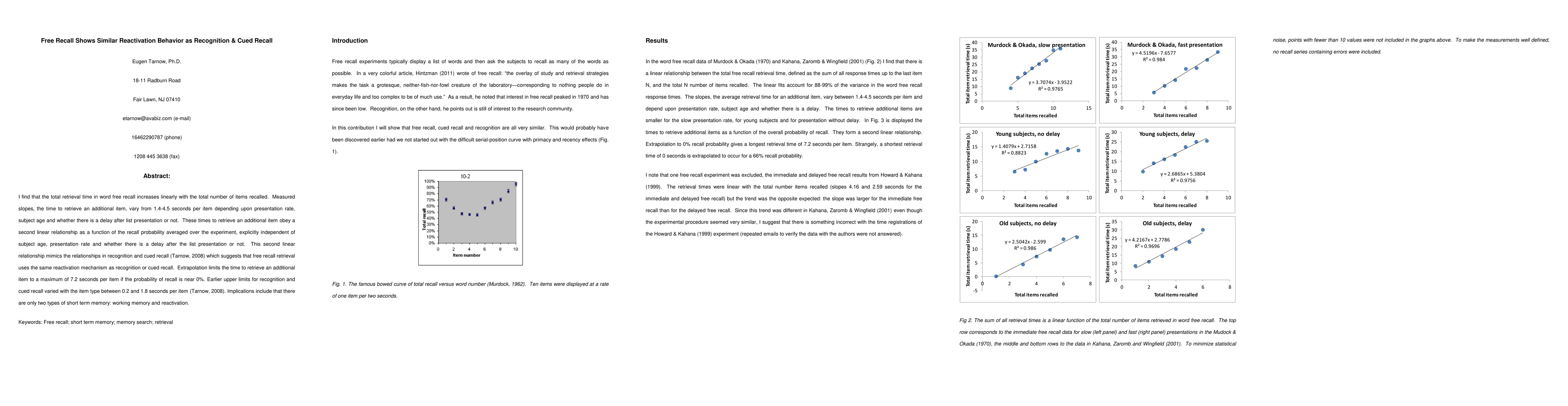 This study finds that free recall retrieval time increases linearly with the number of items recalled, similar to recognition and cued recall, indicating shared reactivation mechanisms. The time to retrieve an additional item in free recall is comparable to earlier findings in recognition and cued recall, suggesting a unified short-term memory framework.