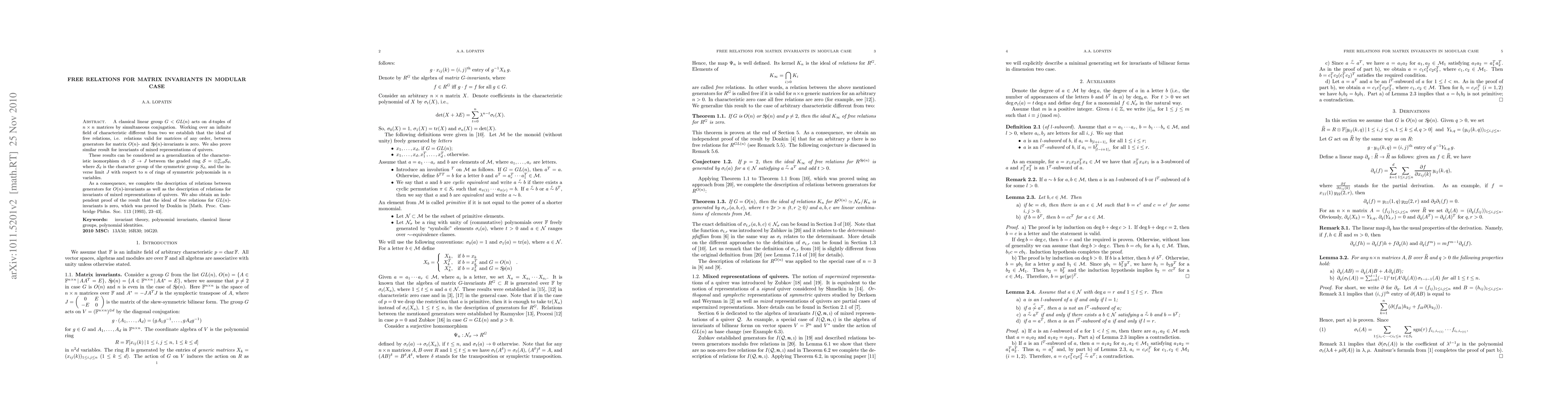 Researchers prove that ideal of free relations for matrix invariants in modular case is zero, generalizing a characteristic isomorphism between symmetric groups and inverse limits of rings of symmetric polynomials.