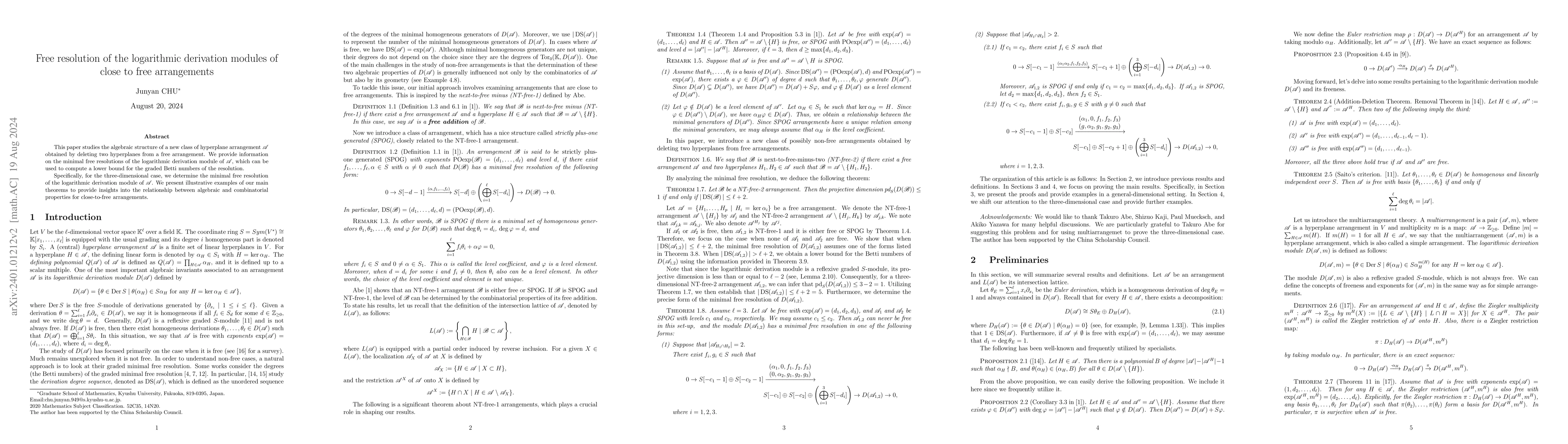 The paper presents detailed analysis and proofs of minimal free resolutions for logarithmic derivation modules of close-to-free hyperplane arrangements, along with characterizations for SPOG arrangements.