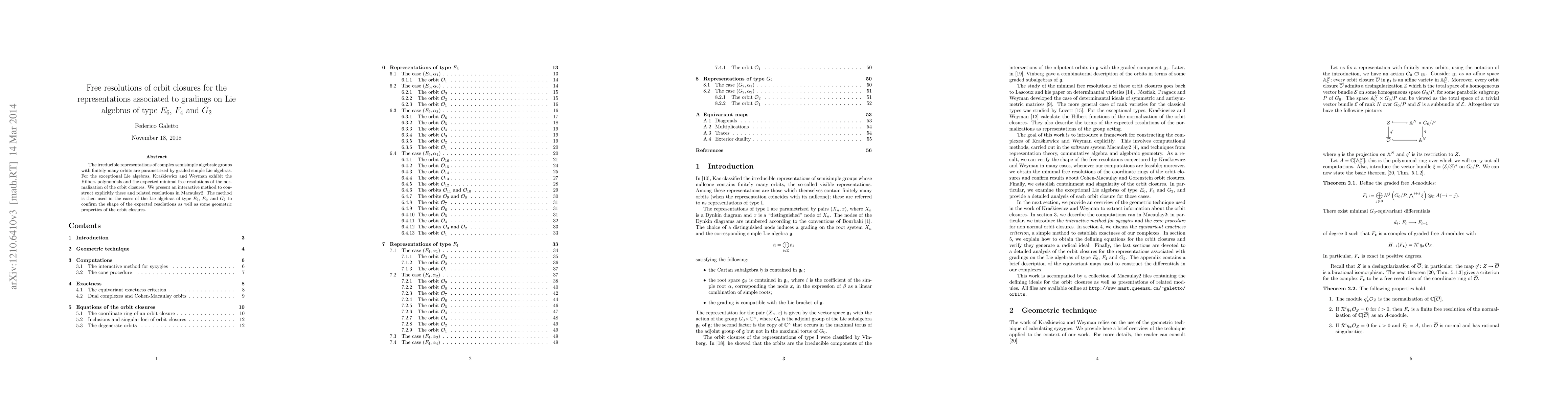 This paper presents an interactive method in Macaulay2 to construct free resolutions for orbit closures of representations associated with gradings on exceptional Lie algebras $E_6$, $F_4$, and $G_2$. It confirms the expected minimal free resolutions and explores geometric properties of the orbit closures.