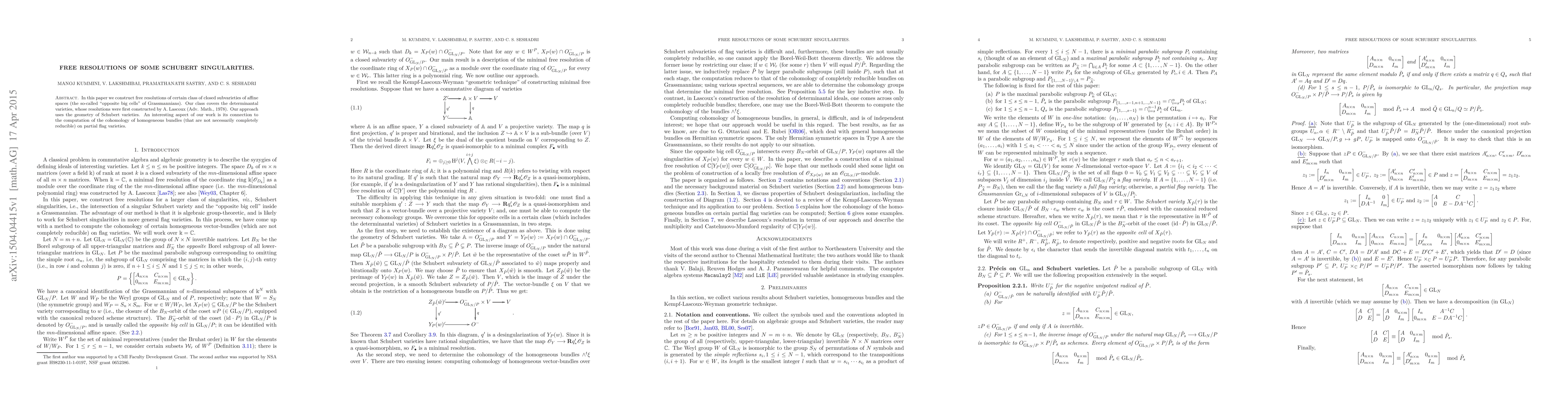 In this paper we construct free resolutions of certain class of closed subvarieties of affine spaces (the so-called "opposite big cells" of Grassmannians). Our class covers the determinantal varieties, whose resolutions were first constructed by A. Lascoux (Adv. Math., 1978). Our approach uses the geometry of Schubert varieties. An interesting aspect of our work is its connection to the computation of the cohomology of homogeneous bundles (that are not necessarily completely reducible) on partial flag varieties.