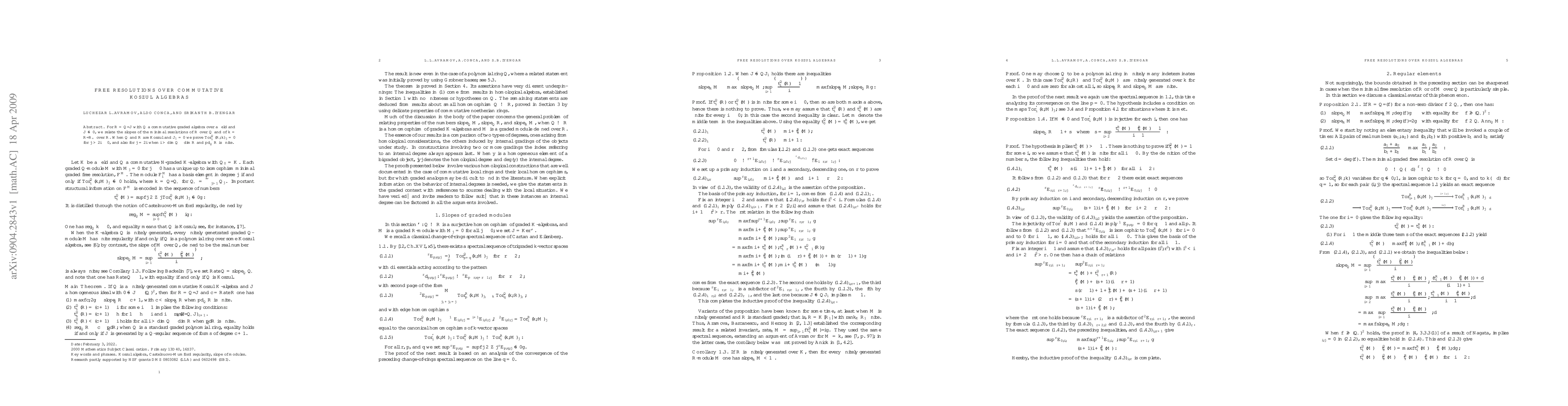 Summary: The paper investigates free resolutions over commutative Koszul algebras, demonstrating a relationship between the slopes of minimal resolutions of R over Q and k=R/R+ over R. It proves specific vanishing conditions for Tor groups under certain dimensions and finite projective dimensions.