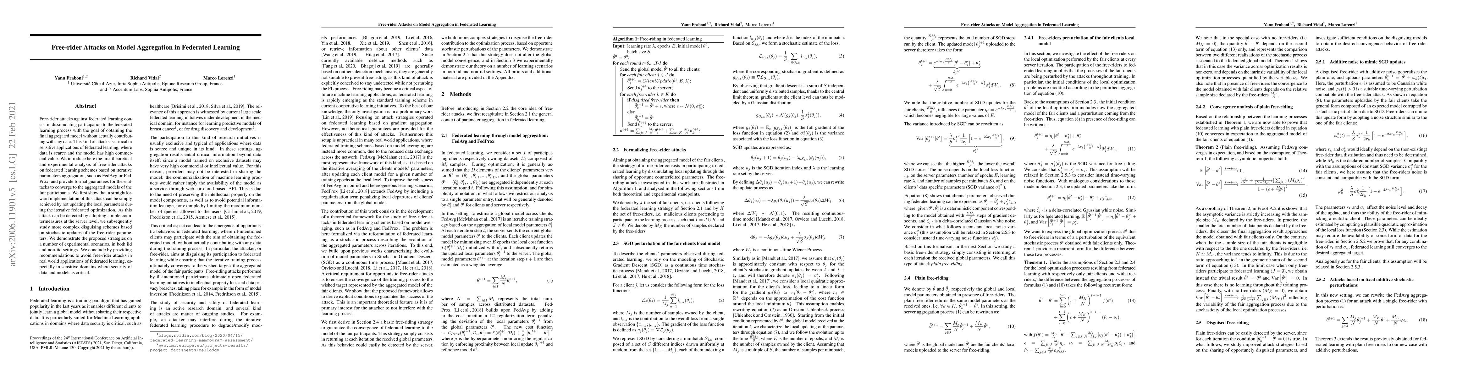Free-rider attacks against federated learning consist in dissimulating participation to the federated learning process with the goal of obtaining the final aggregated model without actually contributing with any data. This kind of attacks is critical in sensitive applications of federated learning, where data is scarce and the model has high commercial value. We introduce here the first theoretical and experimental analysis of free-rider attacks on federated learning schemes based on iterative parameters aggregation, such as FedAvg or FedProx, and provide formal guarantees for these attacks to converge to the aggregated models of the fair participants. We first show that a straightforward implementation of this attack can be simply achieved by not updating the local parameters during the iterative federated optimization. As this attack can be detected by adopting simple countermeasures at the server level, we subsequently study more complex disguising schemes based on stochastic updates of the free-rider parameters. We demonstrate the proposed strategies on a number of experimental scenarios, in both iid and non-iid settings. We conclude by providing recommendations to avoid free-rider attacks in real world applications of federated learning, especially in sensitive domains where security of data and models is critical.
