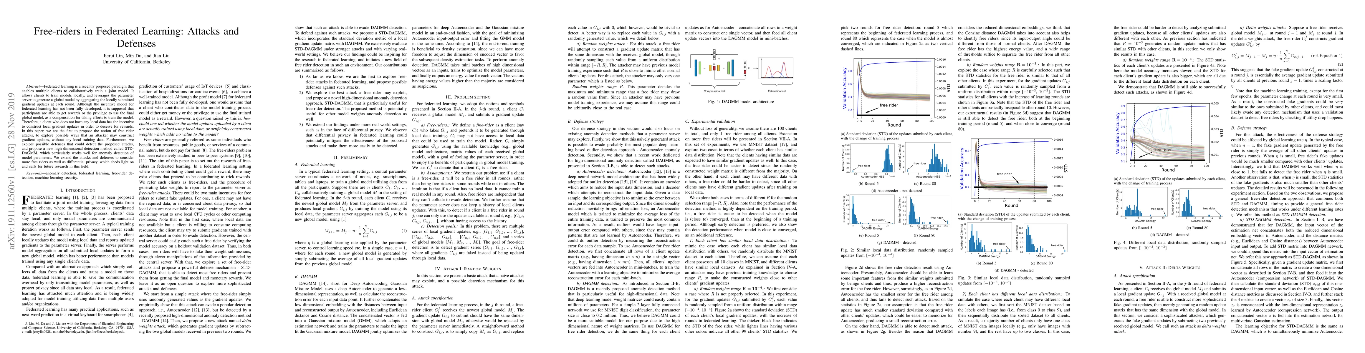This paper introduces the concept of free rider attacks in federated learning, where attackers generate misleading gradient updates without local data. It also proposes STD-DAGMM, a high-dimensional detection method for identifying such attacks, and discusses extending these concepts to consider multiple free riders and differential privacy.