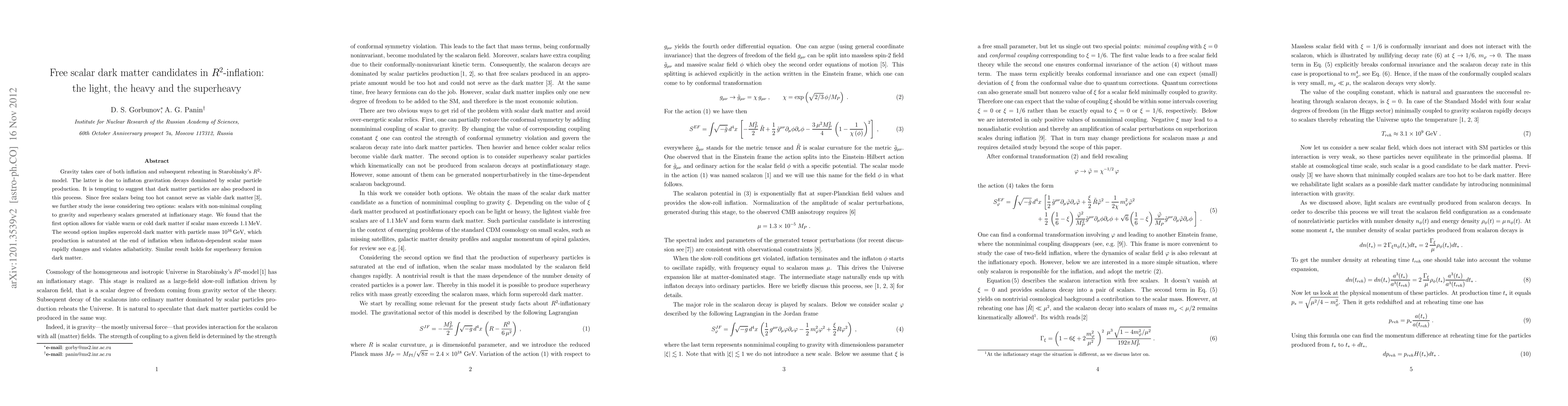 This paper investigates potential free scalar dark matter candidates in the context of Starobinsky's R^2-inflation model, exploring both non-minimally coupled scalars and superheavy scalars generated during inflation. It finds viable warm or cold dark matter scenarios for scalars with masses exceeding 0.8 MeV and supercold dark matter for particles with masses around 10^16 GeV.