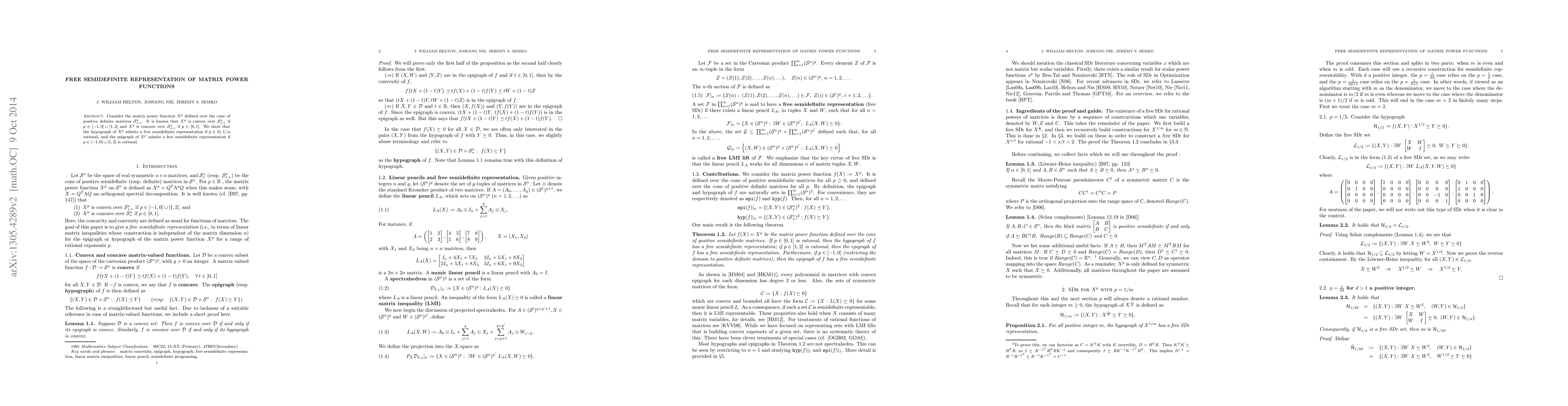 This paper demonstrates that the matrix power function X^p is convex or concave over positive definite matrices depending on the interval of p. It further proves that the hypograph of X^p has a free semidefinite representation when p is rational in [0,1], and the epigraph of X^p has a free semidefinite representation when p is rational in [-1,0] or [1,2].