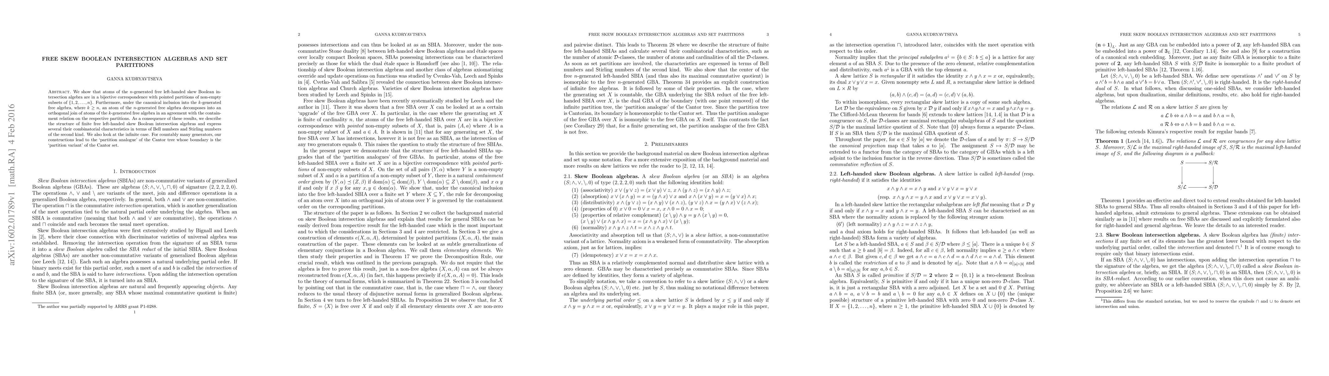 We show that atoms of the $n$-generated free left-handed skew Boolean intersection algebra are in a bijective correspondence with pointed partitions of non-empty subsets of $\{1,2,\dots, n\}$. Furthermore, under the canonical inclusion into the $k$-generated free algebra, where $k\geq n$, an atom of the $n$-generated free algebra decomposes into an orthogonal join of atoms of the $k$-generated free algebra in an agreement with the containment relation on the respective partitions. As a consequence of these results, we describe the structure of finite free left-handed skew Boolean intersection algebras and express several their combinatorial characteristics in terms of Bell numbers and Stirling numbers of the second kind. We also look at the infinite case. For countably many generators, our constructions lead to the `partition analogue' of the Cantor tree whose boundary is the `partition variant' of the Cantor set.
