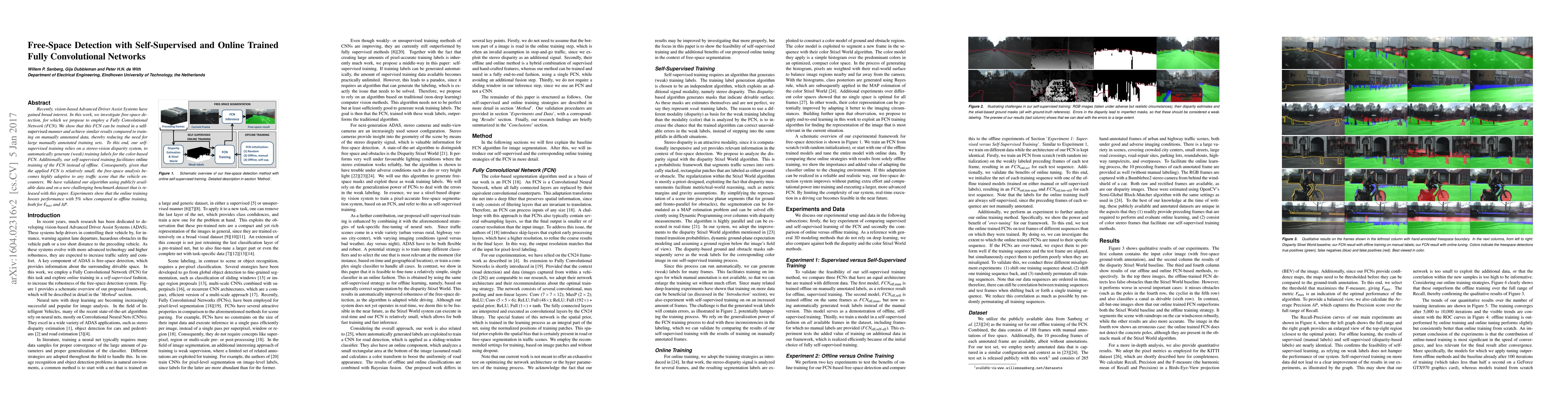 Researchers developed a self-supervised method using fully convolutional networks to detect free space in traffic scenes without large annotated datasets. Their online training approach outperforms offline training with 5% boost in performance.