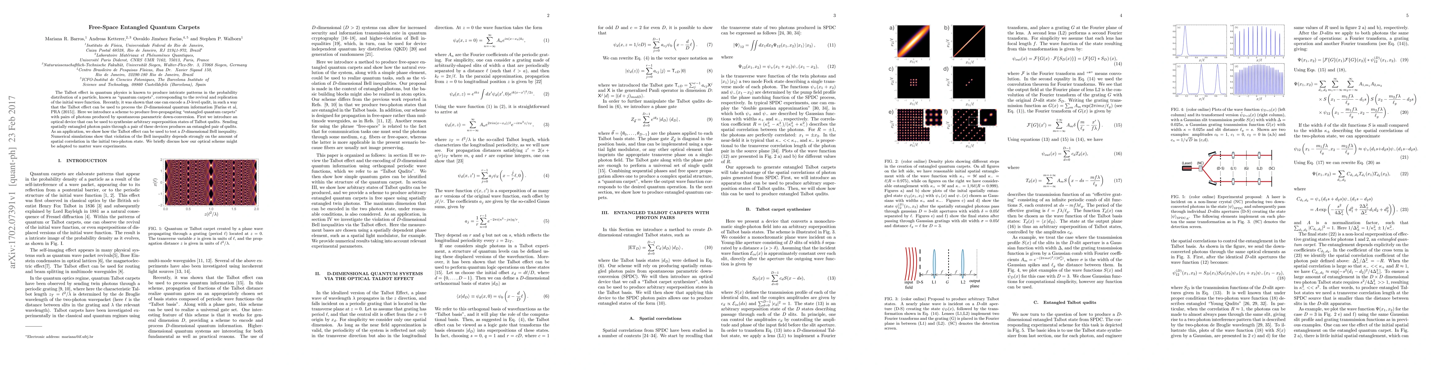 The Talbot effect in quantum physics is known to produce intricate patterns in the probability distribution of a particle, known as "quantum carpets", corresponding to the revival and replication of the initial wave function. Recently, it was shown that one can encode a $D$-level qudit, in such a way that the Talbot effect can be used to process the $D$-dimensional quantum information [Far\'{\i}as et al, PRA (2015)]. Here we introduce a scheme to produce free-propagating "entangled quantum carpets" with pairs of photons produced by spontaneous parametric down-conversion. First we introduce an optical device that can be used to synthesize arbitrary superposition states of Talbot qudits. Sending spatially entangled photon pairs through a pair of these devices produces an entangled pair of qudits. As an application, we show how the Talbot effect can be used to test a $D$-dimensional Bell inequality. Numerical simulations show that violation of the Bell inequality depends strongly on the amount of spatial correlation in the initial two-photon state. We briefly discuss how our optical scheme might be adapted to matter wave experiments.