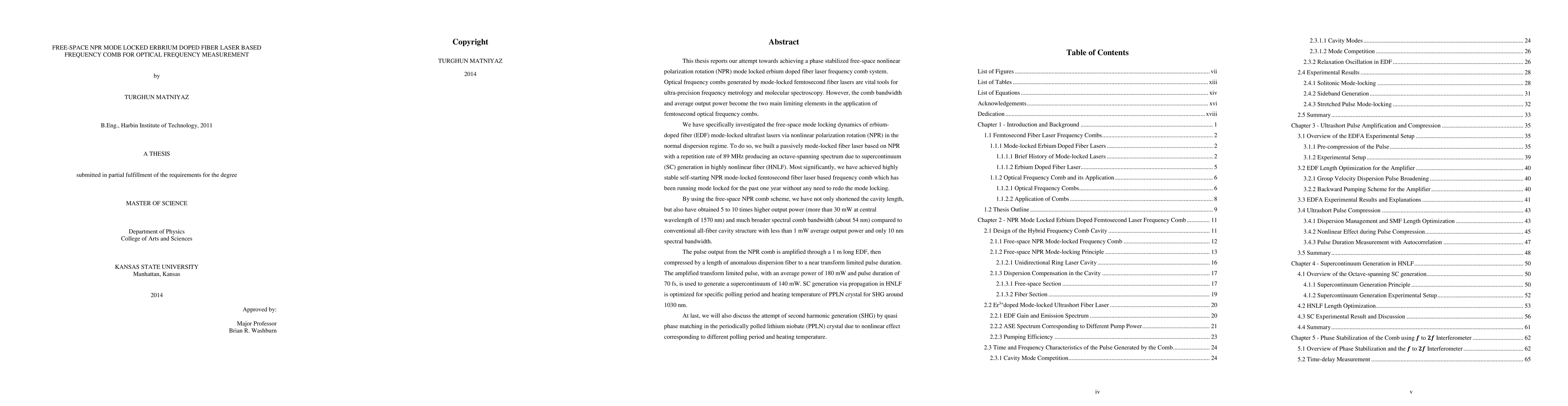 This research develops a free-space, nonlinear polarization rotation (NPR) mode-locked erbium-doped fiber laser for optical frequency measurement, achieving stable, self-starting femtosecond pulses with an octave-spanning spectrum and significantly higher output power and broader spectral bandwidth compared to conventional all-fiber designs.