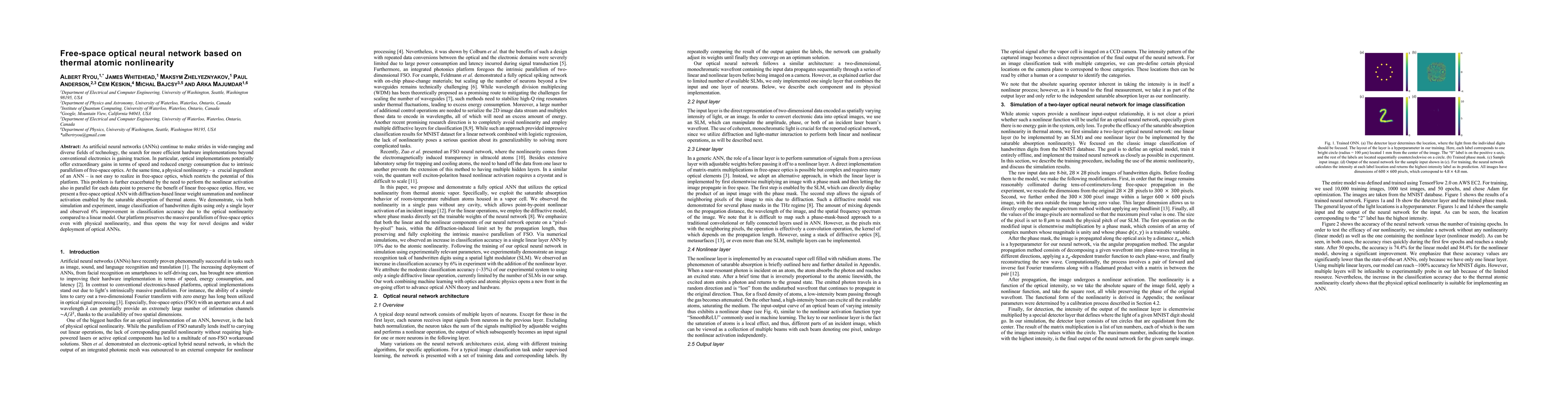 As artificial neural networks (ANNs) continue to make strides in wide-ranging and diverse fields of technology, the search for more efficient hardware implementations beyond conventional electronics is gaining traction. In particular, optical implementations potentially offer extraordinary gains in terms of speed and reduced energy consumption due to intrinsic parallelism of free-space optics. At the same time, a physical nonlinearity, a crucial ingredient of an ANN, is not easy to realize in free-space optics, which restricts the potential of this platform. This problem is further exacerbated by the need to perform the nonlinear activation also in parallel for each data point to preserve the benefit of linear free-space optics. Here, we present a free-space optical ANN with diffraction-based linear weight summation and nonlinear activation enabled by the saturable absorption of thermal atoms. We demonstrate, via both simulation and experiment, image classification of handwritten digits using only a single layer and observed 6-percent improvement in classification accuracy due to the optical nonlinearity compared to a linear model. Our platform preserves the massive parallelism of free-space optics even with physical nonlinearity, and thus opens the way for novel designs and wider deployment of optical ANNs.