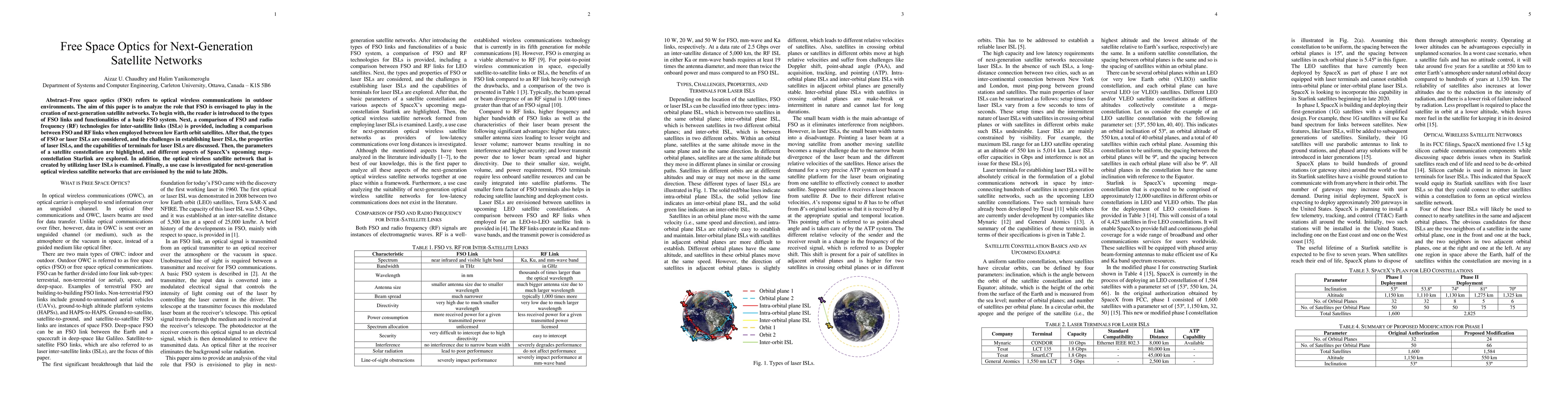 This paper explores the potential of free space optics (FSO) in next-generation satellite networks, comparing FSO and radio frequency (RF) technologies for inter-satellite links and discussing the challenges, properties, and capabilities of laser-based ISLs, with a focus on SpaceX's Starlink constellation and future optical wireless satellite networks.