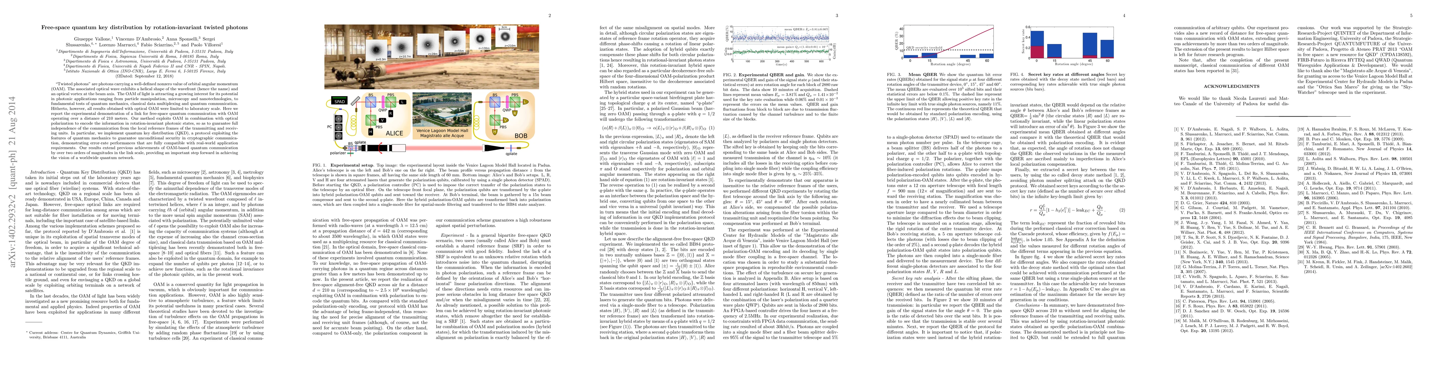 Twisted photons are photons carrying a well-defined nonzero value of orbital angular momentum (OAM). The associated optical wave exhibits a helical shape of the wavefront (hence the name) and an optical vortex at the beam axis. The OAM of light is attracting a growing interest for its potential in photonic applications ranging from particle manipulation, microscopy and nanotechnologies, to fundamental tests of quantum mechanics, classical data multiplexing and quantum communication. Hitherto, however, all results obtained with optical OAM were limited to laboratory scale. Here we report the experimental demonstration of a link for free-space quantum communication with OAM operating over a distance of 210 meters. Our method exploits OAM in combination with optical polarization to encode the information in rotation-invariant photonic states, so as to guarantee full independence of the communication from the local reference frames of the transmitting and receiving units. In particular, we implement quantum key distribution (QKD), a protocol exploiting the features of quantum mechanics to guarantee unconditional security in cryptographic communication, demonstrating error-rate performances that are fully compatible with real-world application requirements. Our results extend previous achievements of OAM-based quantum communication by over two orders of magnitudes in the link scale, providing an important step forward in achieving the vision of a worldwide quantum network.
