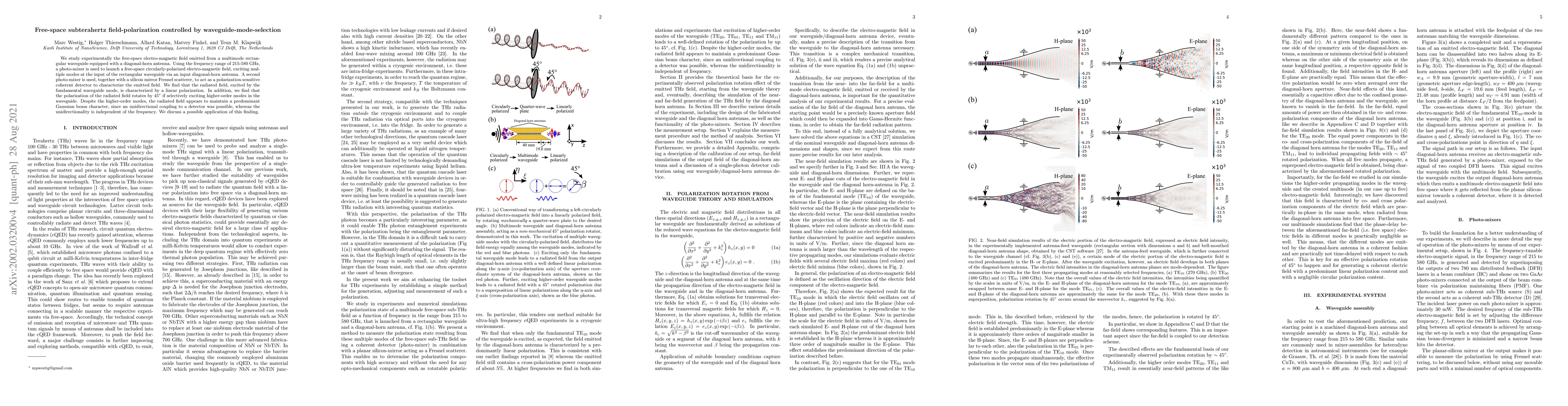 We study experimentally the free-space electro-magnetic field emitted from a multimode rectangular waveguide equipped with a diagonal-horn antenna. Using the frequency range of 215-580 GHz, a photo-mixer is used to launch a free-space circularly-polarized electro-magnetic field, exciting multiple modes at the input of the rectangular waveguide via an input diagonal-horn antenna. A second photo-mixer is used, together with a silicon mirror Fresnel scatterer, to act as a polarization-sensitive coherent detector to characterize the emitted field. We find that the radiated field, excited by the fundamental waveguide mode, is characterized by a linear polarization. In addition, we find that the polarization of the radiated field rotates by 45 degree if selectively exciting higher-order modes in the waveguide. Despite the higher-order modes, the radiated field appears to maintain a predominant Gaussian beam character, since an unidirectional coupling to a detector was possible, whereas the unidirectionality is independent of the frequency. We discuss a possible application of this finding.