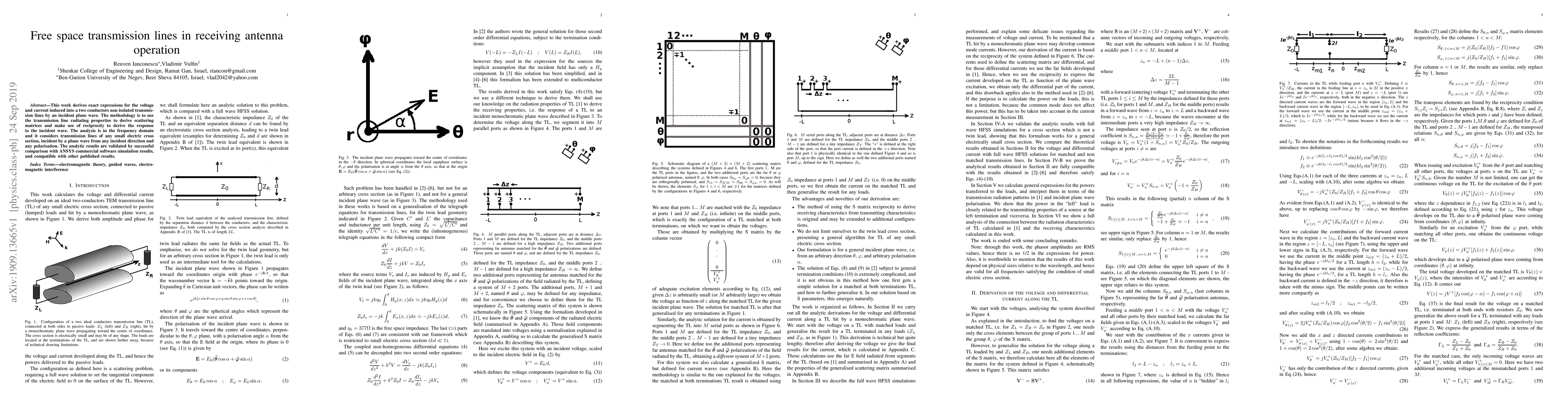 This work derives exact expressions for the voltage and current induced into a two conductors non isolated transmission lines by an incident plane wave. The methodology is to use the transmission line radiating properties to derive scattering matrices and make use of reciprocity to derive the response to the incident wave. The analysis is in the frequency domain and it considers transmission lines of any small electric cross section, incident by a plane wave from any incident direction and any polarisation. The analytic results are validated by successful comparison with ANSYS commercial software simulation results, and compatible with other published results.