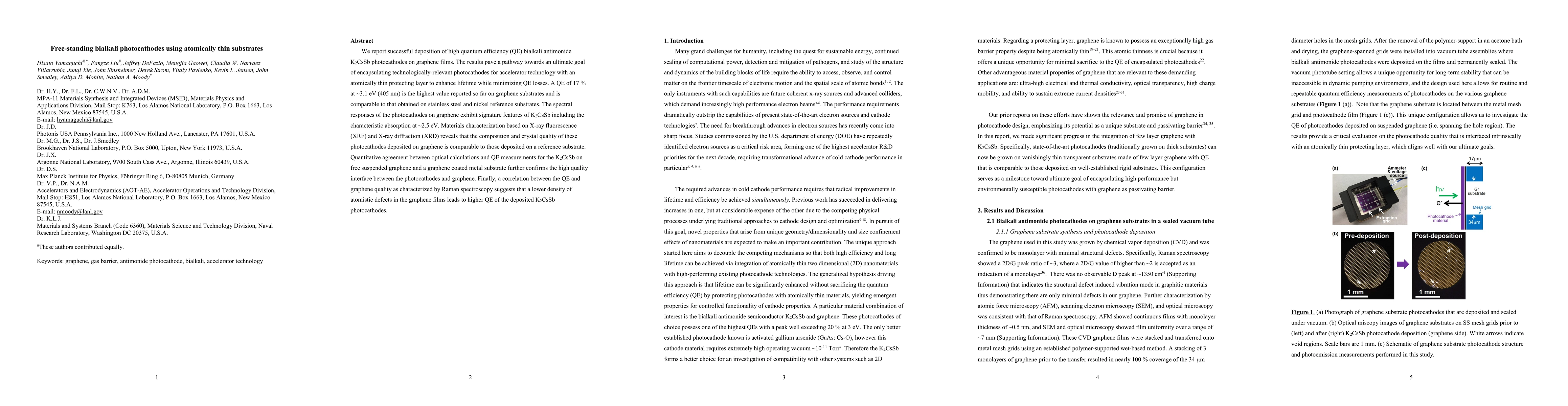 This paper reports the successful deposition of high quantum efficiency bialkali antimonide K2CsSb photocathodes on graphene films, achieving a QE of 17% at 3.1 eV, comparable to stainless steel and nickel substrates. The study highlights the potential of graphene for protecting photocathodes in accelerator technology while minimizing quantum efficiency losses.