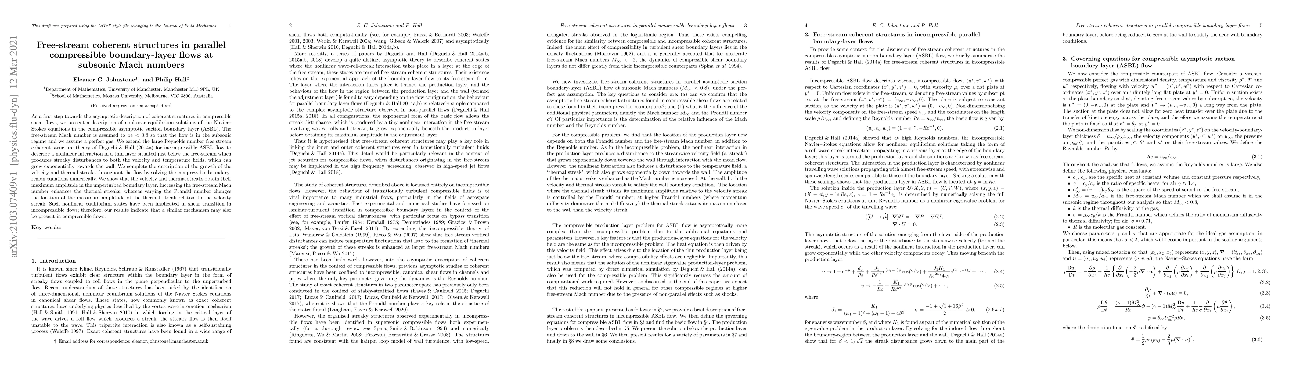 As a first step towards the asymptotic description of coherent structures in compressible shear flows, we present a description of nonlinear equilibrium solutions of the Navier--Stokes equations in the compressible asymptotic suction boundary layer (ASBL). The free-stream Mach number is assumed to be $< 0.8$ so that the flow is in the subsonic regime and we assume a perfect gas. We extend the large-Reynolds number free-stream coherent structure theory of \cite{deguchi_hall_2014a} for incompressible ASBL flow to describe a nonlinear interaction in a thin layer situated just below the free-stream which produces streaky disturbances to both the velocity and temperature fields, which can grow exponentially towards the wall. We complete the description of the growth of the velocity and thermal streaks throughout the flow by solving the compressible boundary-region equations numerically. We show that the velocity and thermal streaks obtain their maximum amplitude in the unperturbed boundary layer. Increasing the free-stream Mach number enhances the thermal streaks, whereas varying the Prandtl number changes the location of the maximum amplitude of the thermal streak relative to the velocity streak. Such nonlinear equilibrium states have been implicated in shear transition in incompressible flows; therefore, our results indicate that a similar mechanism may also be present in compressible flows.