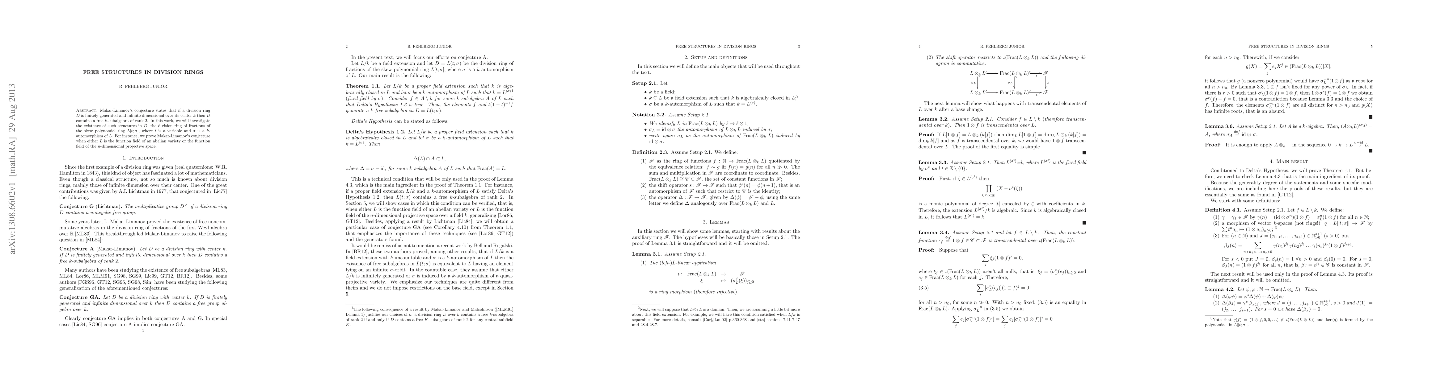 Makar-Limanov's conjecture states that if a division ring D is finitely generated and infinite dimensional over its center k then D contains a free k-subalgebra of rank 2. In this work, we will investigate the existence of such structures in D, the division ring of fractions of the skew polynomial ring L[t;\sigma], where t is a variable and $\sigma$ is a k-automorphism of L. For instance, we prove Makar-Limanov's conjecture when either L is the function field of an abelian variety or the function field of the n-dimensional projective space.