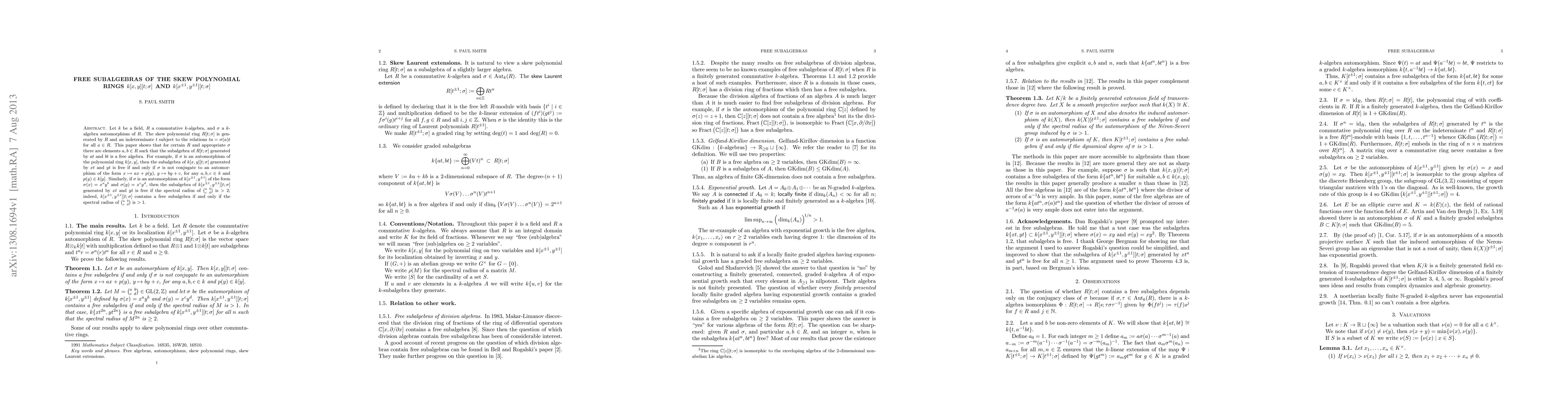 Let \sigma be an automorphism of a commutative k-algebra R. The skew polynomial ring R[t;\sigma] is generated by R and an indeterminate t subject to the relations ta=\sigma(a)t for all a in R. For certain R and appropriate \sigma there are elements a and b in R such that the subalgebra of R[t;\sigma] generated by at and bt is a free algebra. If \sigma is an automorphism of the polynomial ring k[x,y], then the subalgebra of k[x,y][t;\sigma] generated by xt and yt is free if and only if \sigma is not conjugate to an elementary automorphism. If \sigma is an automorphism of k[x,x^{-1},y,y^{- 1}] of the form \sigma(x)=x^ay^b and \sigma(y)=x^cy^d, then the subalgebra of k[x,x^{-1},y,y^{- 1}][t;\sigma] generated by xt and yt is free if the spectral radius of the 2x2 matrix {{a b} \\ {c d}} is >2; indeed, k[x,x^{-1},y,y^{- 1}][t;\sigma] contains a free subalgebra if and only if the spectral radius of 2x2 matrix {{a b} \\ {c d}} is >1.