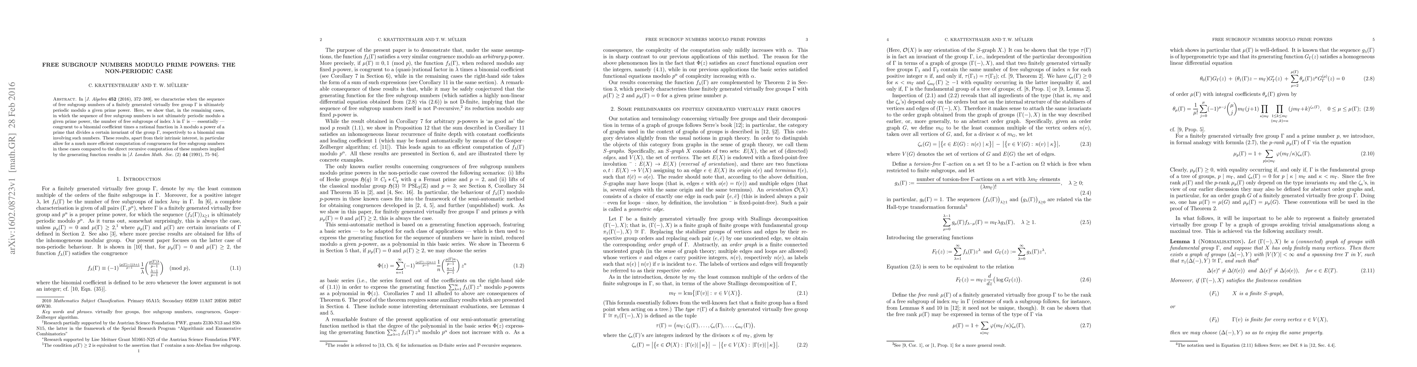 This paper characterizes the non-periodic cases of free subgroup numbers in finitely generated virtually free groups modulo prime powers, showing their congruence to a binomial coefficient times a rational function. It also presents a more efficient computation method compared to previous recursive techniques.