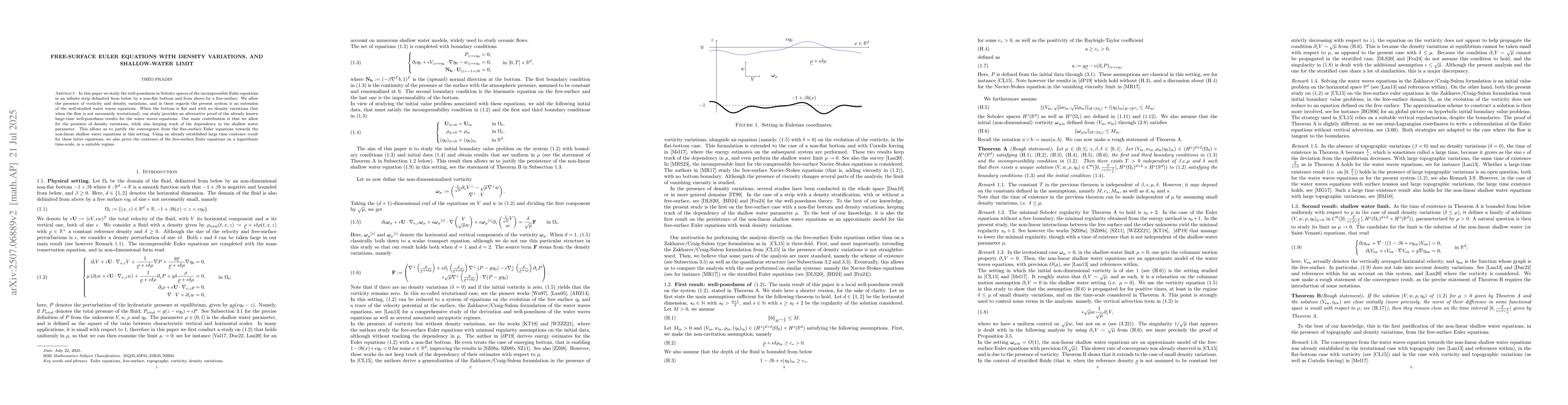 In this paper we study the well-posedness in Sobolev spaces of the incompressible Euler equations in an infinite strip delimited from below by a non-flat bottom and from above by a free-surface. We allow the presence of vorticity and density variations, and in these regards the present system is an extension of the well-studied water waves equations. When the bottom is flat and with no density variations (but when the flow is not necessarily irrotational), our study provides an alternative proof of the already known large-time well-posedness results for the water waves equations. Our main contribution is that we allow for the presence of density variations, while also keeping track of the dependency in the shallow water parameter. This allows us to justify the convergence from the free-surface Euler equations towards the non-linear shallow water equations in this setting. Using an already established large time existence result for these latter equations, we also prove the existence of the free-surface Euler equations on a logarithmic time-scale, in a suitable regime.