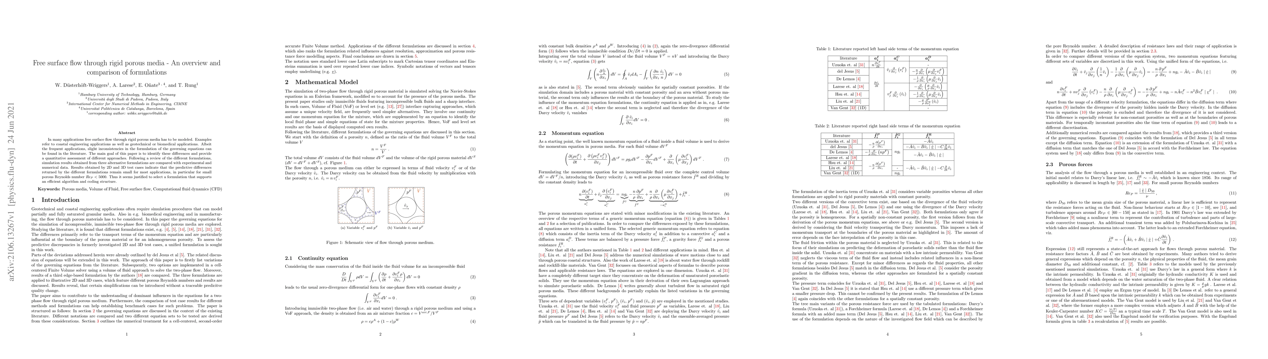 A study compares different formulations for modeling free surface flow through rigid porous media, finding that most approaches produce similar results, especially at low Reynolds numbers.