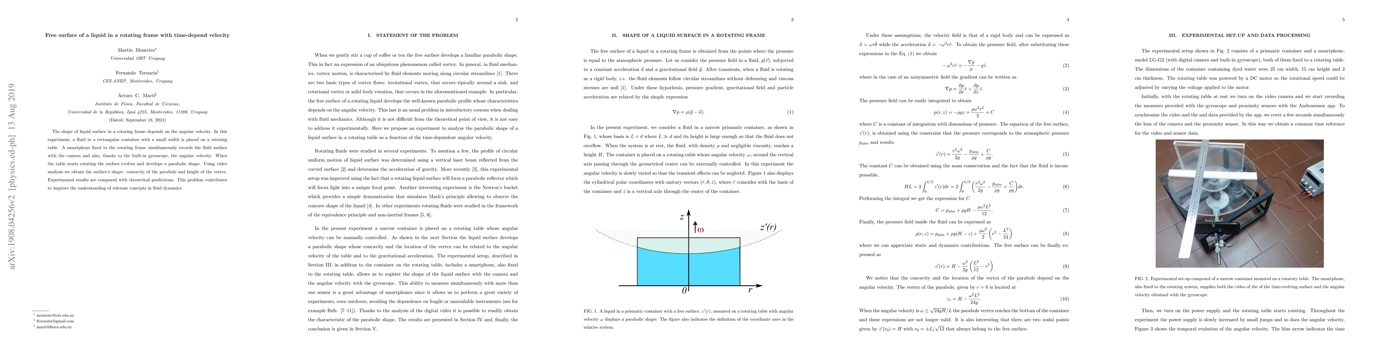 The shape of liquid surface in a rotating frame depends on the angular velocity. In this experiment, a fluid in a rectangular container with a small width is placed on a rotating table. A smartphone fixed to the rotating frame simultaneously records the fluid surface with the camera and also, thanks to the built-in gyroscope, the angular velocity. When the table starts rotating the surface evolves and develops a parabolic shape. Using video analysis we obtain the surface's shape: concavity of the parabole and height of the vertex. Experimental results are compared with theoretical predictions. This problem contributes to improve the understanding of relevant concepts in fluid dynamics.
