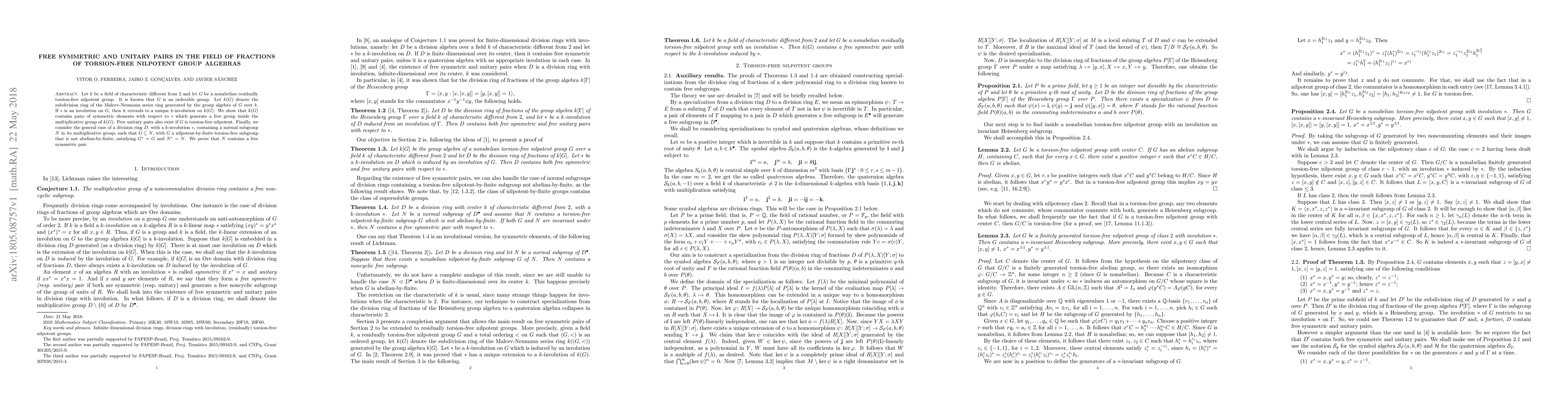 This paper explores the field of fractions of torsion-free nilpotent group algebras over a field of characteristic different from 2. It demonstrates the existence of free symmetric pairs in these algebras, even extending to unitary pairs when the group is torsion-free nilpotent. The study further investigates division rings with specific properties, proving the presence of free symmetric pairs in certain subgroups.