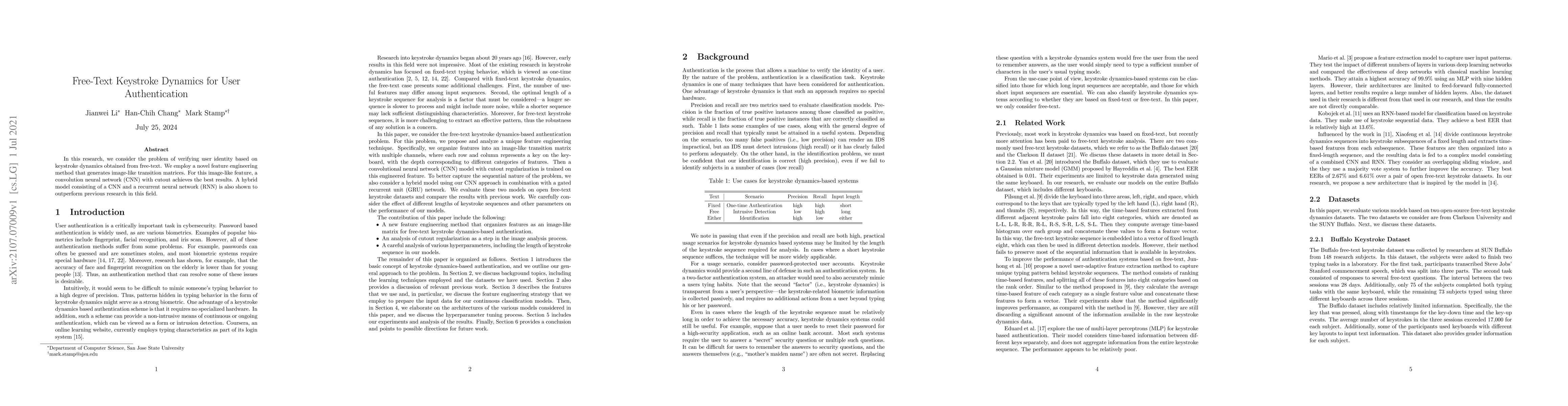 This research proposes a novel method for user authentication using free-text keystroke dynamics, employing a CNN with cutout for image-like transition matrices. A hybrid CNN-RNN model further enhances performance, outperforming previous methods.