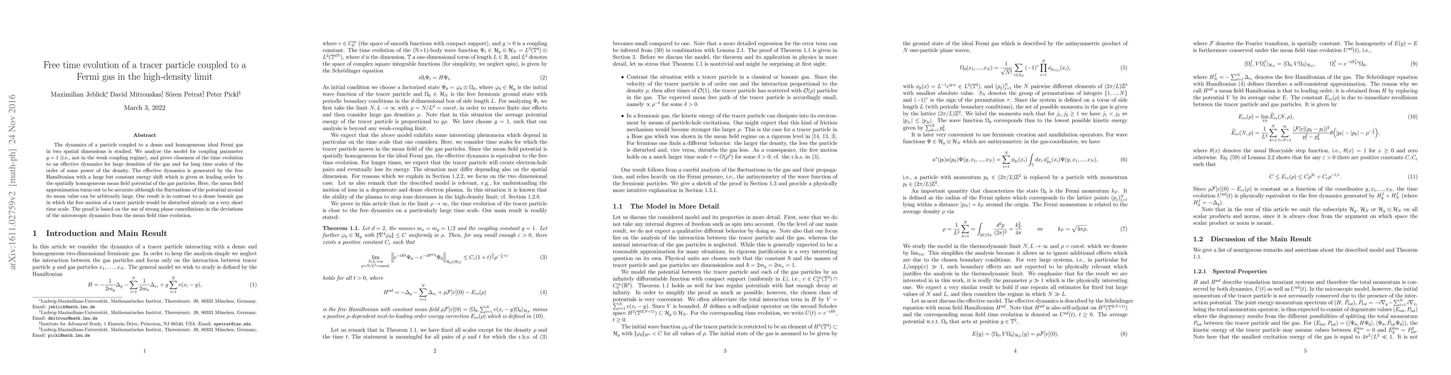 The dynamics of a particle coupled to a dense and homogeneous ideal Fermi gas in two spatial dimensions is studied. We analyze the model for coupling parameter g=1 (i.e., not in the weak coupling regime), and prove closeness of the time evolution to an effective dynamics for large densities of the gas and for long time scales of the order of some power of the density. The effective dynamics is generated by the free Hamiltonian with a large but constant energy shift which is given at leading order by the spatially homogeneous mean field potential of the gas particles. Here, the mean field approximation turns out to be accurate although the fluctuations of the potential around its mean value can be arbitrarily large. Our result is in contrast to a dense bosonic gas in which the free motion of a tracer particle would be disturbed already on a very short time scale. The proof is based on the use of strong phase cancellations in the deviations of the microscopic dynamics from the mean field time evolution.