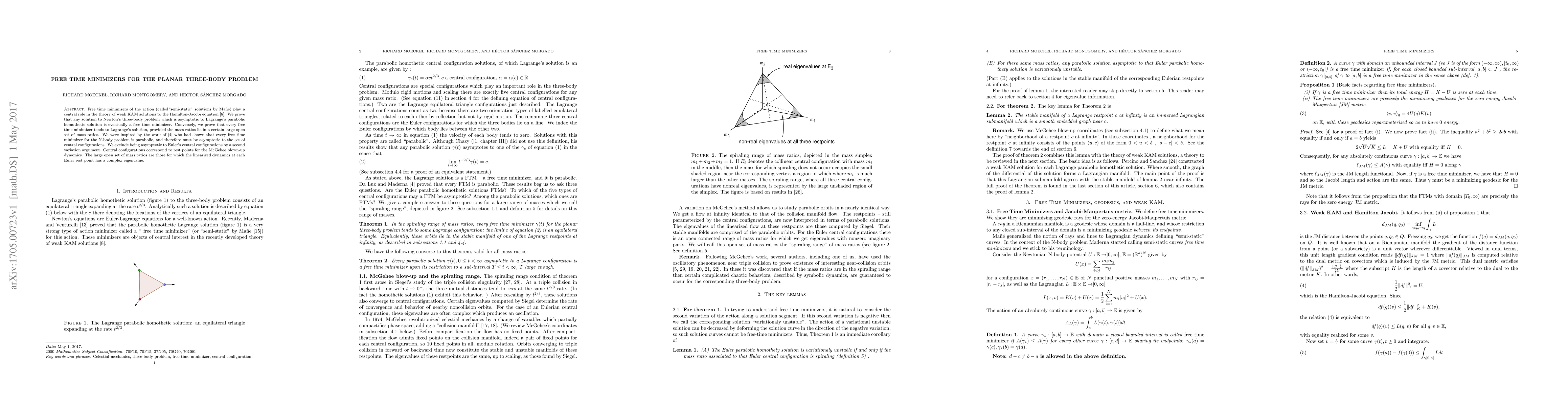 Free time minimizers of the action (called"semi-static" solutions by Ma\~ne) play a central role in the theory of weak KAM solutions to the Hamilton-Jacobi equation (see Fathi). We prove that any solution to Newton's three-body problem which is asymptotic to Lagrange's parabolic homothetic solution is eventually a free time minimizer. Conversely, we prove that every free time minimizer tends to Lagrange's solution, provided the mass ratios lie in a certain large open set of mass ratios. We were inspired by the work of Da Luz-Maderna who had shown that every free time minimizer for the N-body problem is parabolic, and therefore must be asymptotic to the set of central configurations. We exclude being asymptotic to Euler's central configurations by a second variation argument. Central configurations correspond to rest points for the McGehee blown-up dynamics. The large open set of mass ratios are those for which the linearized dynamics at each Euler rest point has a complex eigenvalue.