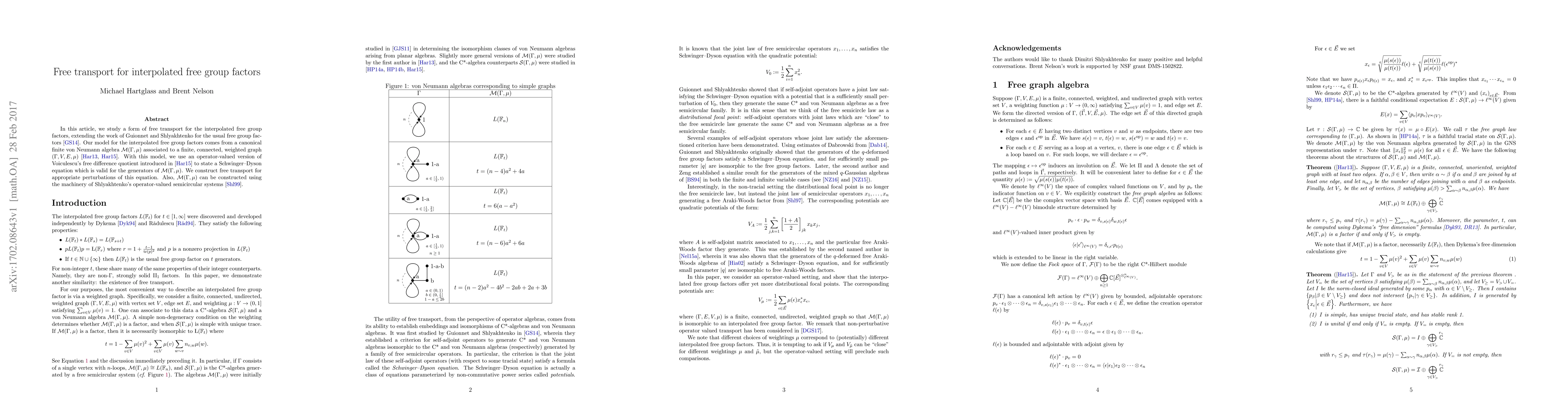 This paper extends the concept of free transport to interpolated free group factors, modeled via a finite von Neumann algebra associated with a weighted graph. It employs an operator-valued version of Voiculescu's free difference quotient to derive a Schwinger-Dyson equation and constructs free transport for its perturbations.