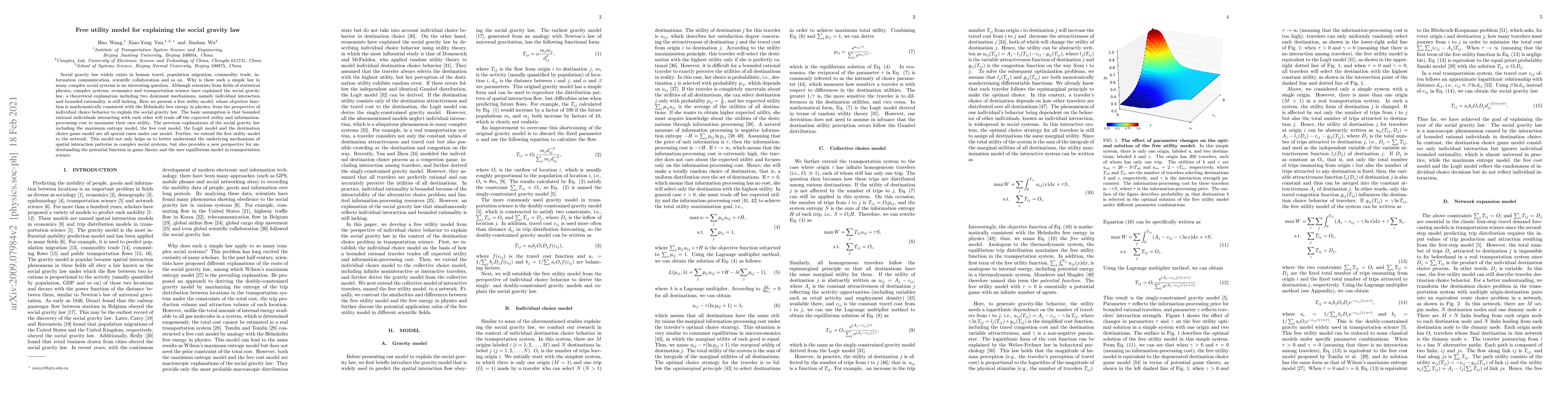 Researchers present a free utility model to explain the social gravity law, which governs human behavior in various complex systems like travel and trade. The model focuses on individual choice behavior and information-processing costs, providing new insights into understanding spatial interaction patterns and game theory concepts.
