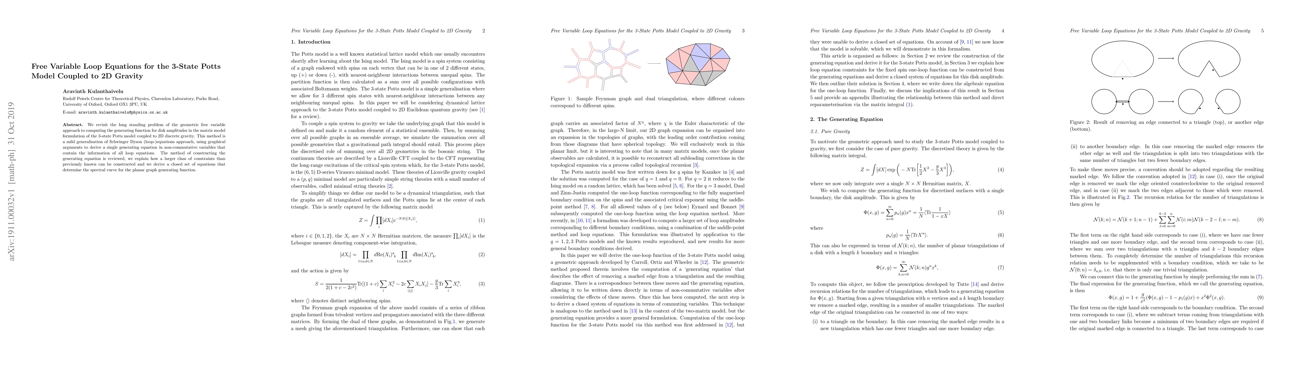 This paper revisits the geometric free variable approach to compute the generating function for disk amplitudes in the 3-state Potts model coupled to 2D discrete gravity, using a generalized Schwinger-Dyson loop equation method. It derives a single generating equation in non-commutative variables and establishes a closed set of equations determining the spectral curve for the planar graph generating function.